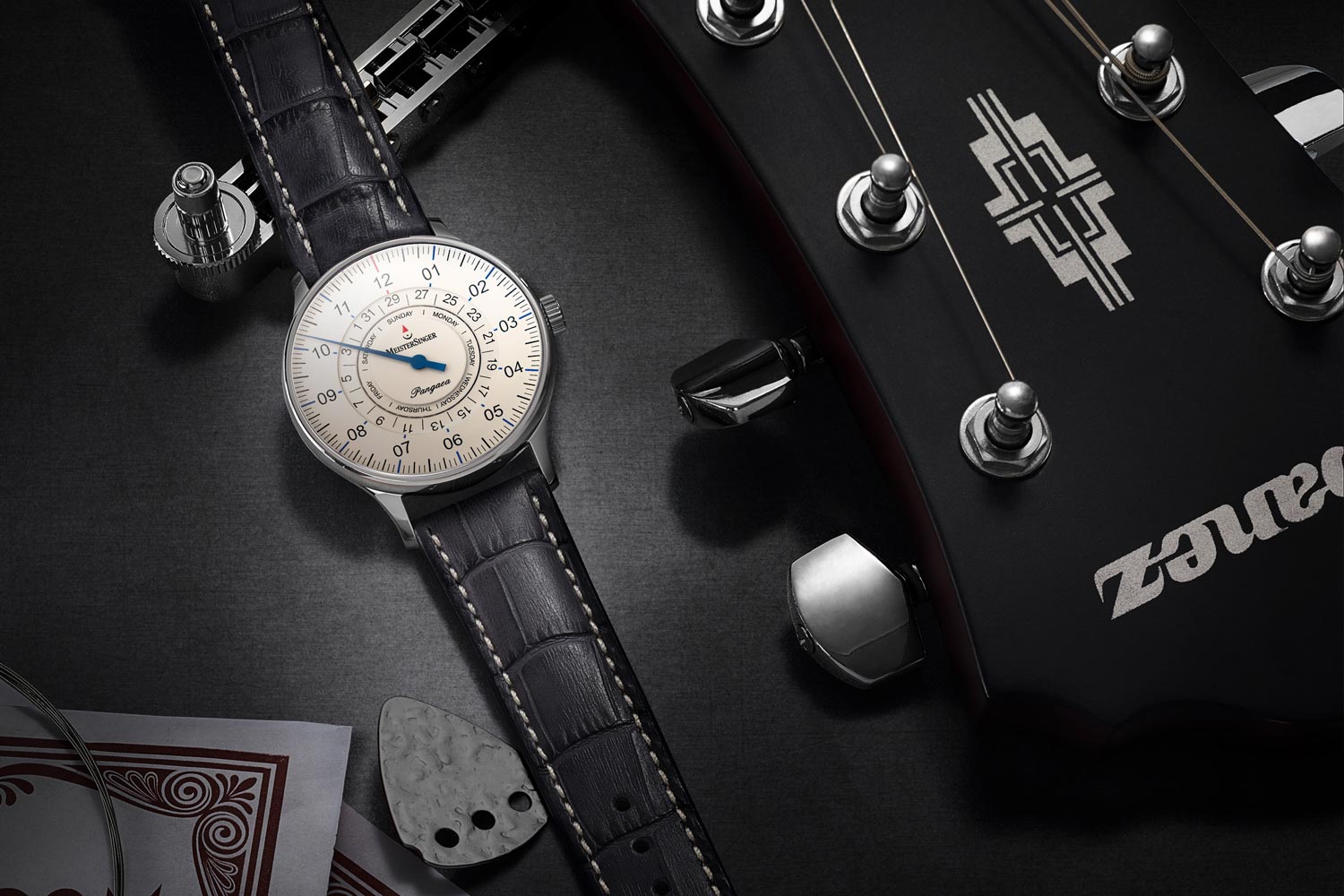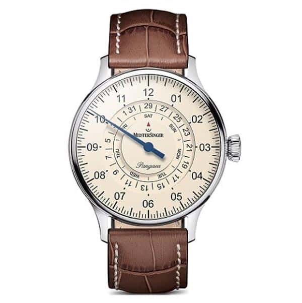 Tijdens een ontspannen dag is een horloge misschien overbodig, maar wie toch globaal wil weten hoe laat het is, kiest voor MeisterSinger. Deze Pangaea Day Date beschikt zoals alle horloges van het Duitse merk over een enkele wijzer die aangeeft hoe laat het ongeveer is. De minuten doen er immers niet toe, laat staan de seconden. Maar ernaar kijken ontspant ook, juist omdat de exacte tijd niet belangrijk is. Het horloge heeft een edelstalen kast met een diameter van 40 millimeter. Door de draaiende ringen is zowel de datum als de dag af te lezen onder de 12-uur positie. Dit horloge wordt aangedreven door een Zwitsers automatisch uurwerk dat een gangreserve van 38 uur heeft.