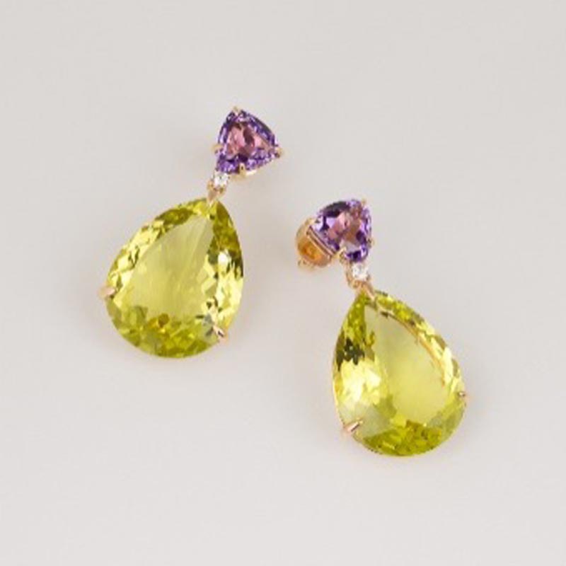 Artur Scholl presenteert sieraden die direct de aandacht trekken. Het merk combineert vakmanschap met een moderne vormtaal, waardoor stukken ontstaan die exclusief én uitgesproken zijn. Deze roségouden oorhangers met amethist, olive quartz en een diamant van 0,11 ct. vormen een krachtig kleurenspel. De contrasterende tinten vangen het licht op een manier die elke outfit extra levendigheid geeft. Een ontwerp voor wie graag zichtbaar iets bijzonders draagt.