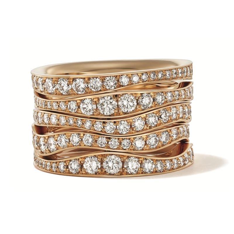Verfijning en vakmanschap komen samen in deze innovatieve ring van Hans D. Krieger. De roségouden banen zijn verbonden met scharnierpunten, waardoor de ring soepel meebeweegt en uitzonderlijk draagcomfort biedt. 120 briljant geslepen diamanten (totaal 2,60 ct.) accentueren het luxueuze karakter en laten het ontwerp vanuit elke hoek schitteren.