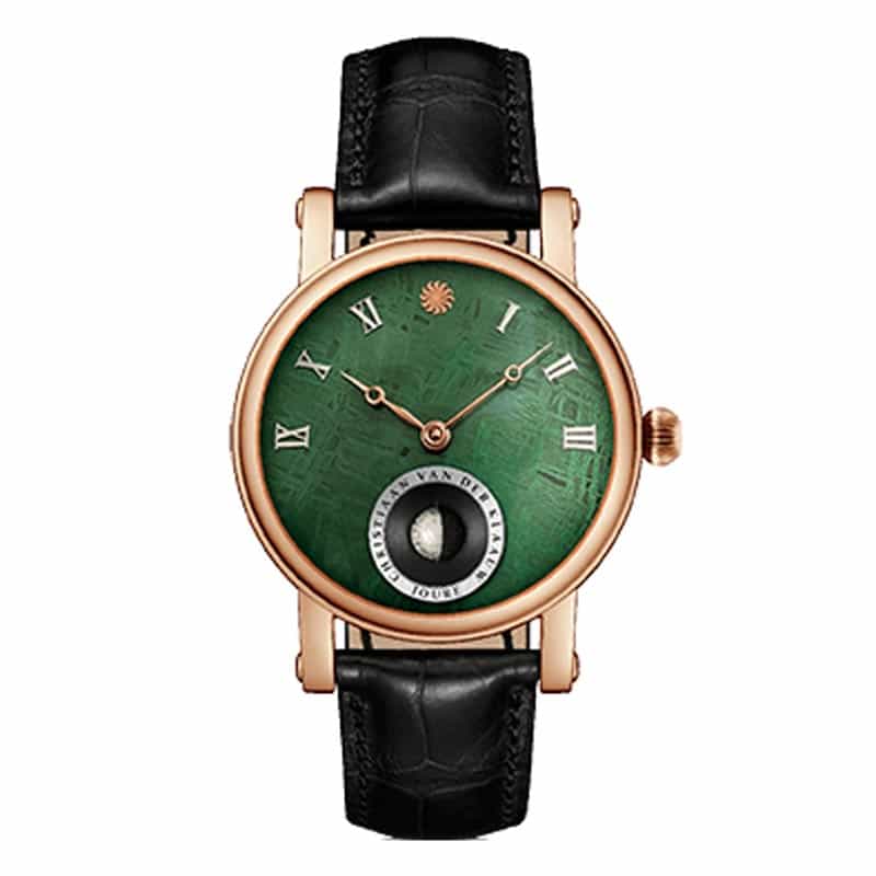 De roségouden CVDK Real Moon Joure geeft een unieke invulling aan een roterende driedimensionale maanfase. De handgemaakte 3D-maan voltooit een omloop om de aarde in 29,530588853 dagen en wijkt slechts één dag af in 11.000 jaar. Hiermee behoort dit mechanisme tot de meest nauwkeurige driedimensionale maanfases die ooit in een mechanisch horloge zijn toegepast. Naast deze uitzonderlijke complicatie toont het horloge uiteraard ook de tijd op een wijzerplaat van groen meteoriet. Meer hebben we toch eigenlijk niet nodig?