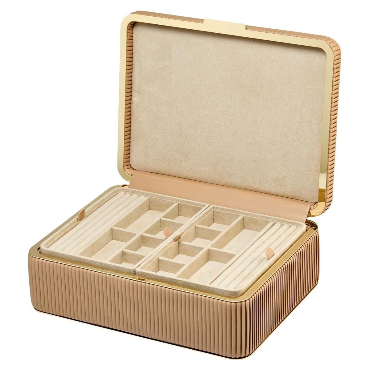 Heeft u een dochter, echtgenote, moeder of zus die werkelijk alles al heeft? Maak haar dan gelukkig met de Bella Large Jewelry Box van Wolf. De Bella sieradenbox straalt luxe uit met haar zachte vegan leren deksel, geplisseerde zijkanten en goudkleurige details. Binnenin bevinden zich drie uitneembare LusterLoc trays met 16 vakjes voor ringen, colliers, armbanden en oorsieraden, plus een ruim vak voor grotere items. Handig voor op reis is de uitneembare vegan leren zip pouch met vier aparte vakjes om sieraden veilig te bewaren. De juwelenbox meet 31,8 x 24,1cm x 10,8 centimeter. Als dat geen indrukwekkend cadeau voor onder de kerstboom is!