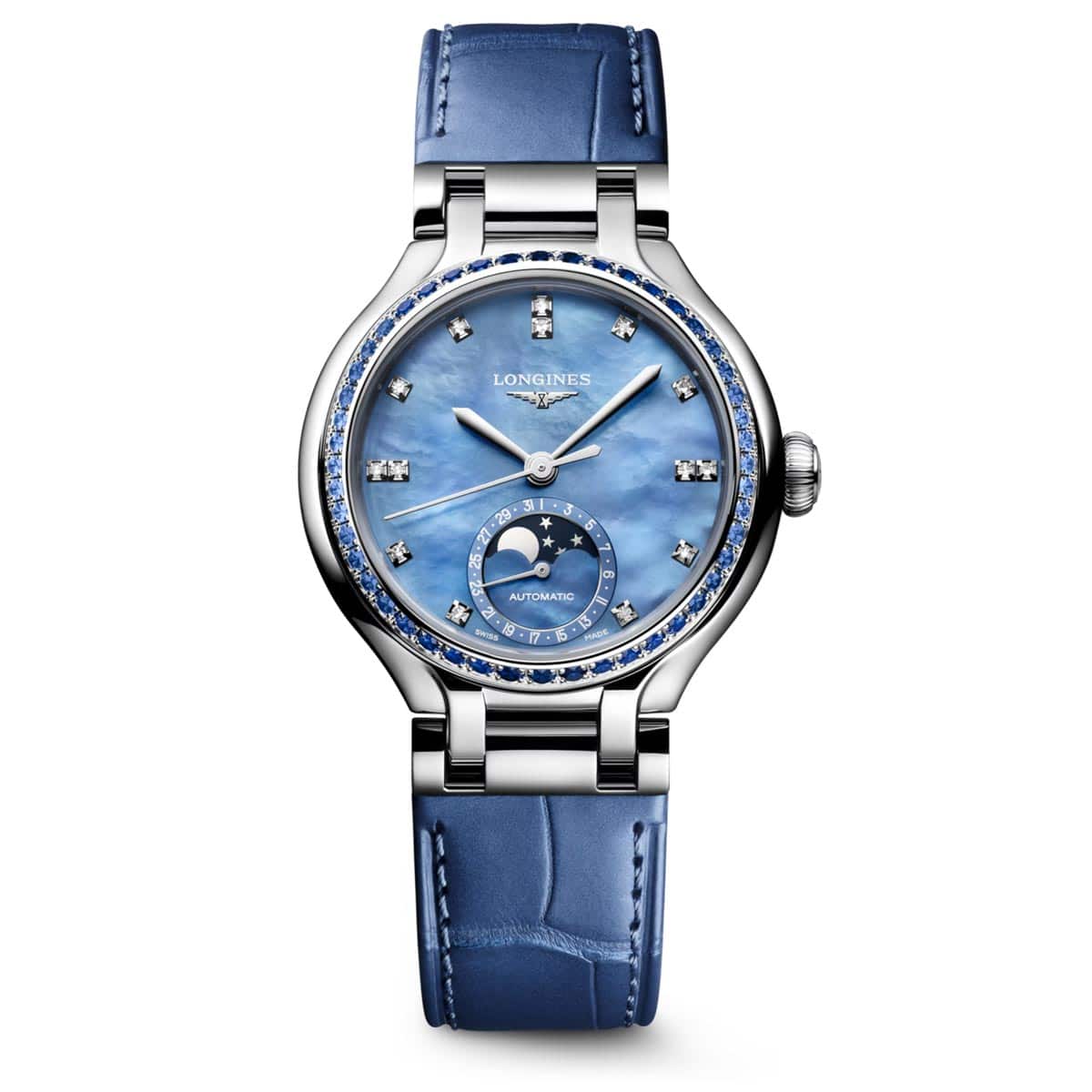De PrimaLuna is een vaste waarde in de collectie van Longines. Terecht, want dit horloge valt bij veel dames in de smaak en is al in vele uitvoeringen verschenen. Elk daarvan belichaamt elegantie en vrouwelijkheid. Dat doet ook de PrimaLuna Moonphase, de nieuwste aanwinst in de collectie. De sierlijk vormgegeven edelstalen kast met een diameter van 34 mm is voorzien van 48 fonkelende blauwe saffieren, Op de wijzerplaat van blauw parelmoer worden de datum en de maanfase op prachtige wijze weergegeven, terwijl 14 briljant geslepen diamanten extra schittering toevoegen. In het hart van de PrimaLuna Moonphase tikt een Zwitsers automatisch uurwerk met een indrukwekkende gangreserve van 72 uur.