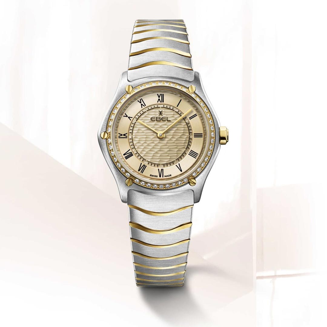 Vakmanschap en luxe ontmoeten Zwitserse precisie in een horloge dat zowel stijlvol als vrouwelijk oogt. Dit gaat over de Sport Classic van Ebel, waarvan de kast van edelstaal en geelgoud is bezet met 47 fonkelende diamanten. Daarbij geeft de beige wijzerplaat met subtiel golfpatroon diepte en karakter. De iconische tweekleurige Wave-schakelband met vouwsluiting zit perfect én maakt een stijlvol statement. Met Zwitsers quartz-uurwerk en waterbestendig tot 50 meter combineert dit horloge functionaliteit met tijdloze elegantie voor de moderne vrouw.