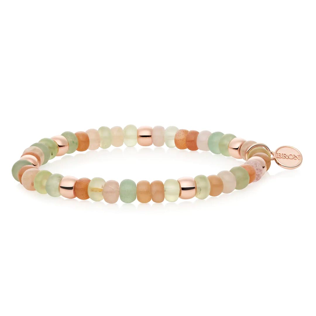 Zonder sluiting en daardoor moeiteloos soepel om de pols vallend: de Reflex armbanden van Bron kenmerken zich door hun comfortabele draaggemak. Ze laten zich gemakkelijk combineren en hebben een ontspannen, luxueuze uitstraling. Draag één exemplaar voor een subtiel accent of combineer meerdere armbanden voor een uitgesprokener effect. Deze edelstenen armband van Bron sluit mooi aan bij de gouden Reflex armbanden. Het ontwerp bestaat uit 18 karaats roségouden elementen, gecombineerd met drie edelstenen: bruine maansteen, roze beryl en prehniet. De armband is verkrijgbaar in verschillende samenstellingen van edelstenen.