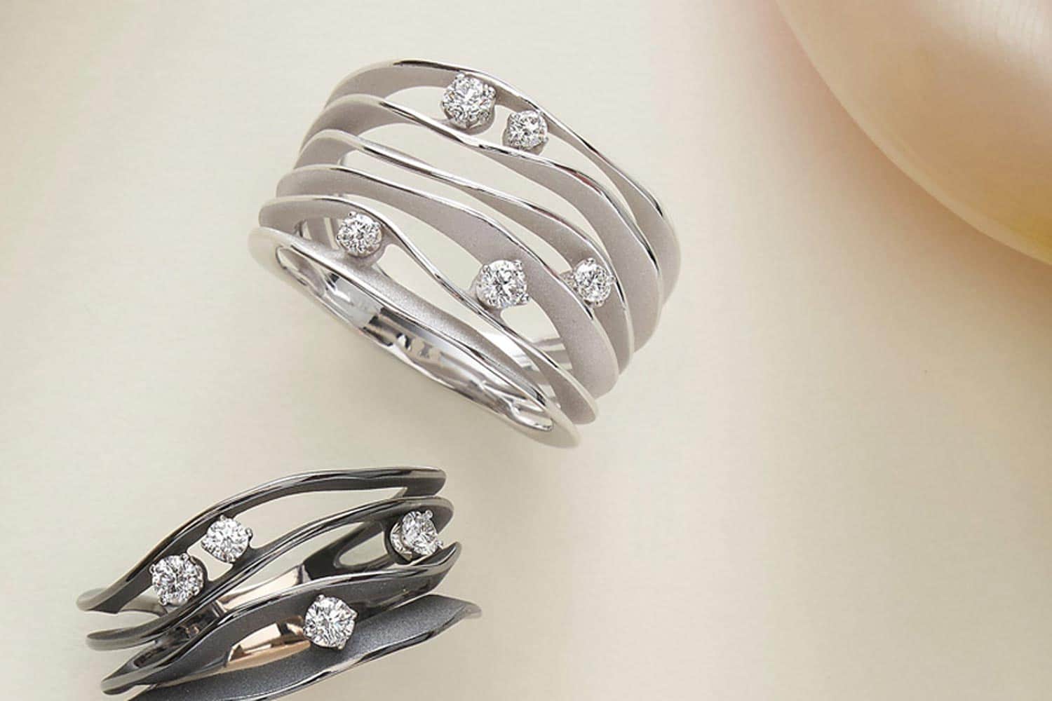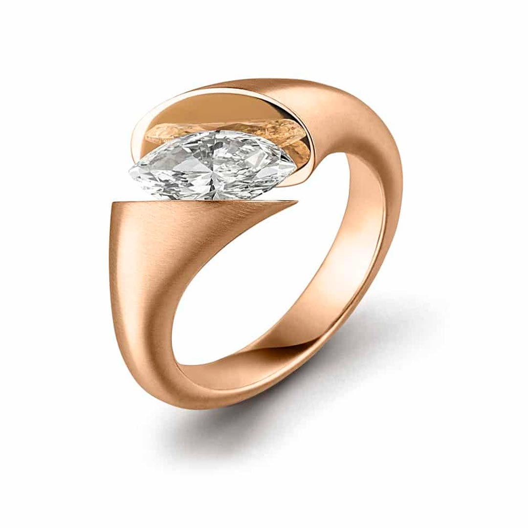 De Calla lelie wordt al sinds de oudheid beschouwd als een symbool van schoonheid en onsterfelijkheid. Schaffrath vat deze bijzondere bloem in een roségouden ring waarin de marquise geslepen diamant gewichtloos lijkt te zweven tussen twee gouden kelken. Hoogglans gepolijste spiegeloppervlakken reflecteren het licht intens, waardoor de diamant in de tint Top Light Brown een magische schittering krijgt. De matte afwerking van het goud zorgt voor een spannend contrast. Het resultaat is een luxueuze ring met een sensuele uitstraling.