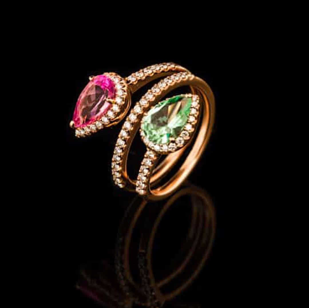 In deze ring van Artur Scholl begroeten een roze en een mintgroene toermalijn elkaar nadat ze een dubbele ronde om de vinger hebben gevolgd. Zij leggen een weg af van roségoud, verlicht door witte diamanten. Hun eindbestemming is een harmonieus kruispunt van licht en kleur, dat de speelse elegantie van de ring volledig onthult.