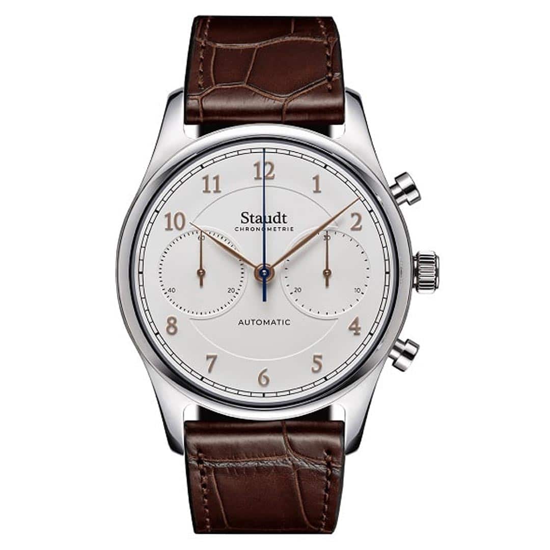 Dat een ingetogen ontwerp buitengewoon indrukwekkend kan zijn, bewijst Staudt Chronometrie met de Prelude Chronograph. Het herenhorloge heeft een edelstalen kast met een saffierglazen achterzijde waardoor het uurwerk zichtbaar is. Dit is een automatisch uurwerk dat niet alleen nauwkeurig de tijd aangeeft, maar ook de chronograaf aanstuurt. De Prelude Chronograph is echter niet alleen horlogetechnisch interessant, maar ook buitengewoon stijlvol draagbaar. Door de gebogen bandaanzet valt het horloge prettig om de pols. De witte wijzerplaat, rosévergulde cijfers en een alligatorleren band dragen bij aan de klassieke uitstraling.