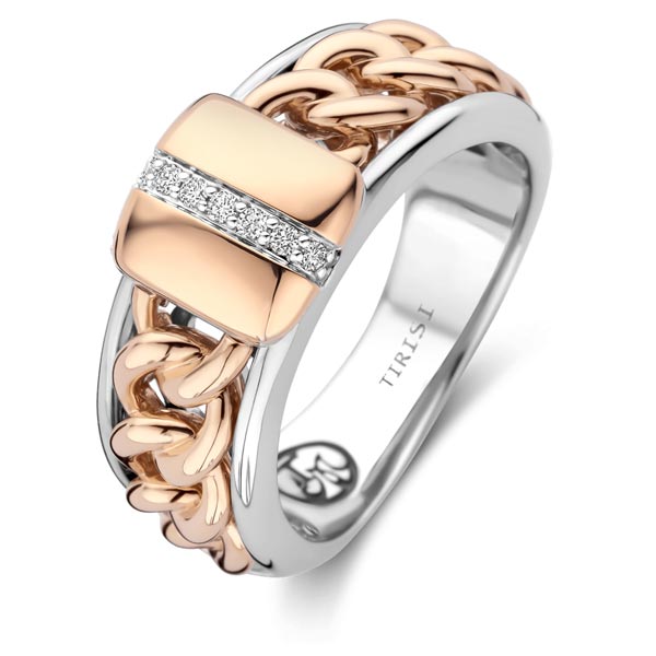 We zien de combinatie van materialen in deze ring van zilver en 18 karaat roségoud. In de ring schitteren briljant geslepen diamanten. De verweven schakels verlenen de ring kracht en elegantie in perfectie harmonie. Het ontwerp en de combinatie van materialen maken deze ring tot een echte eyecatcher.