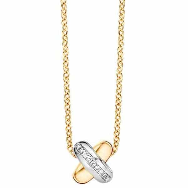 Wie zegt dat een sieraad of van goud of van zilver gemaakt moet zijn? Dat deze materialen ook uitstekend samengaan toont Tirisi Moda met dit collier. Het is vervaardigd van zilver en geelgoud. In de zilveren baan van het ‘kusje’ zijn 13 briljant geslepen diamanten gezet.