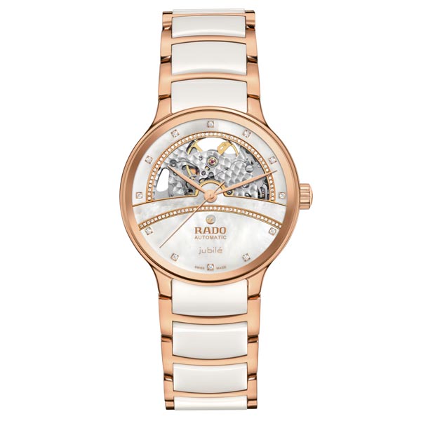 De Centrix Automatic Diamonds Open Heart laat zich uitstekend combineren met een modieus armbandje. Dit doet ook niets af aan de uitstraling van het horloge want de Centrix Open Heart valt op door een groot venster, dat het geavanceerde R734 automatische uurwerk prachtig omlijst. Het iconische horloge krijgt zijn volledige uitstraling door de aangepaste kastbanden en een armband van gepolijst roestvrij staal met roségoudkleurige PVD-coating en witte hightech-keramische middenlinks. De witte parelmoeren wijzerplaat met 12 diamanten, benadrukt door het roségoudkleurige geprinte “jubilé”-logo, sluit perfect aan bij de wijzers. De Super Jubilé-versie voegt een extra fonkelende rij van 86 diamanten toe langs de onderboog van de brug, als ultiem symbool van hartstochtelijke elegantie en finesse. Het horloge is waterbestendig tot 50 meter.