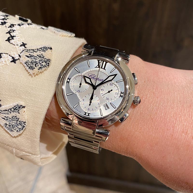 Het bij Van Hell juweliers ondergebrachte pre-owned horloge behoort tot de Imperiale collectie en combineert elegantie met functionaliteit. Dit model heeft een diameter van 40 mm, een automatische gangreserve van 42 uur en een chronograaf met datumaanduiding. De parelmoeren wijzerplaat wordt beschermd door saffierglas, terwijl de edelstalen kast en band met dubbele vouwsluiting het horloge een stevige en luxueuze uitstraling geven. Het horloge wordt geleverd met doos en papieren.