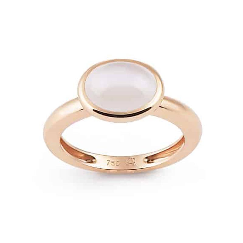 Een witte maansteen in combinatie met de warme tint van roségoud. Het is een combinatie die aan de lichtheid van het voorjaar doet denken. Dat voorjaar draagt u mee in de vorm van de Amici-ring. De ring op zichzelf heeft een serene uitstraling, maar is ook te combineren tot een meer uitbundige en persoonlijke look.