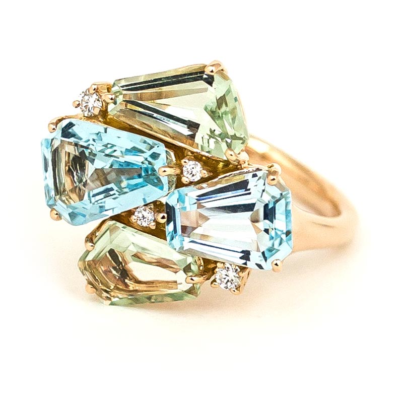 Twee lichtblauwe topazen, twee groene amethisten en de schittering van diamant. Het is de kleur van de lentehemel, de natuur die tot leven komt en de zon die straalt. Maar het is ook een ring van Artur Scholl, die zelfs op de meer sombere lentedagen een sprankeling brengt. De roségouden ring is een combinatie van vakmanschap, elegantie en levendige tinten. Kortom, het is een uniek kunstwerk om met trots te dragen.