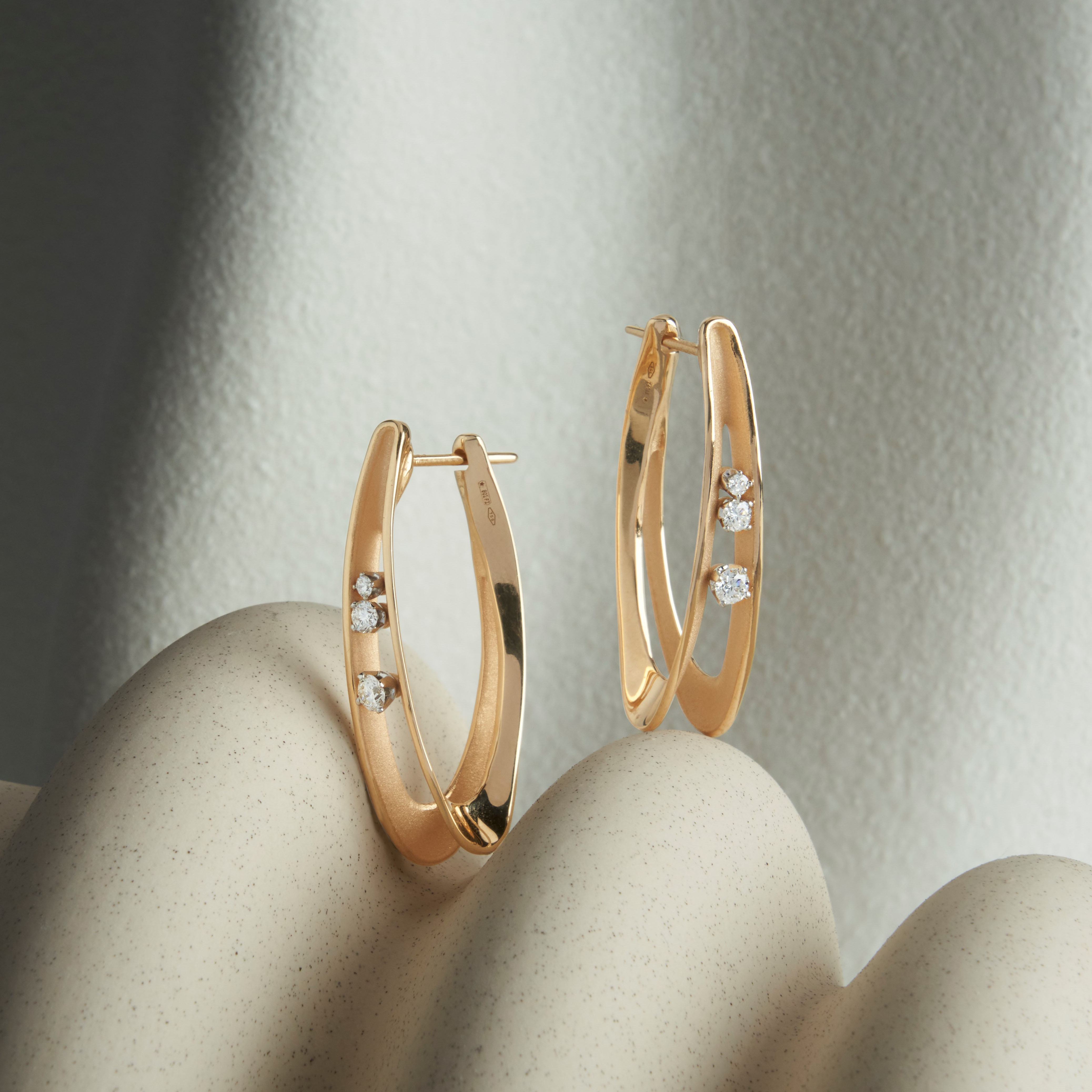 In de ontwerpen van Annamaria Cammilli zien we naast creativiteit ook het vakmanschap van de goudsmid. De driedimensionaliteit van de vormen wordt versterkt door de afwisseling tussen de gepolijste oppervlakken en de speciale fluweelachtige afwerking van goud. Deze eigen Aetherna afwerkingsmethode geeft de juwelen van Cammilli een zijdezacht uiterlijk. Bijzonder zijn ook de beroemde acht kleuren goud van Cammilli. Dit is een hulpmiddel om de creatieve mogelijkheden uit te breiden door met verschillende tinten te spelen, en tegelijkertijd elke vrouw de nuance te laten kiezen die het beste bij haar persoonlijkheid en huidskleur past. De Dune serie is het bekendste uit de collectie van Annamaria Cammilli. Deze oorhangers zijn uitgevoerd in Orange Apricot gold, een speciale legering tussen geel- en roségoud in, ontworpen door Annamaria Cammilli. De oorhangers zijn speels gezet met in totaal 4 diamanten, van verschillende groottes.