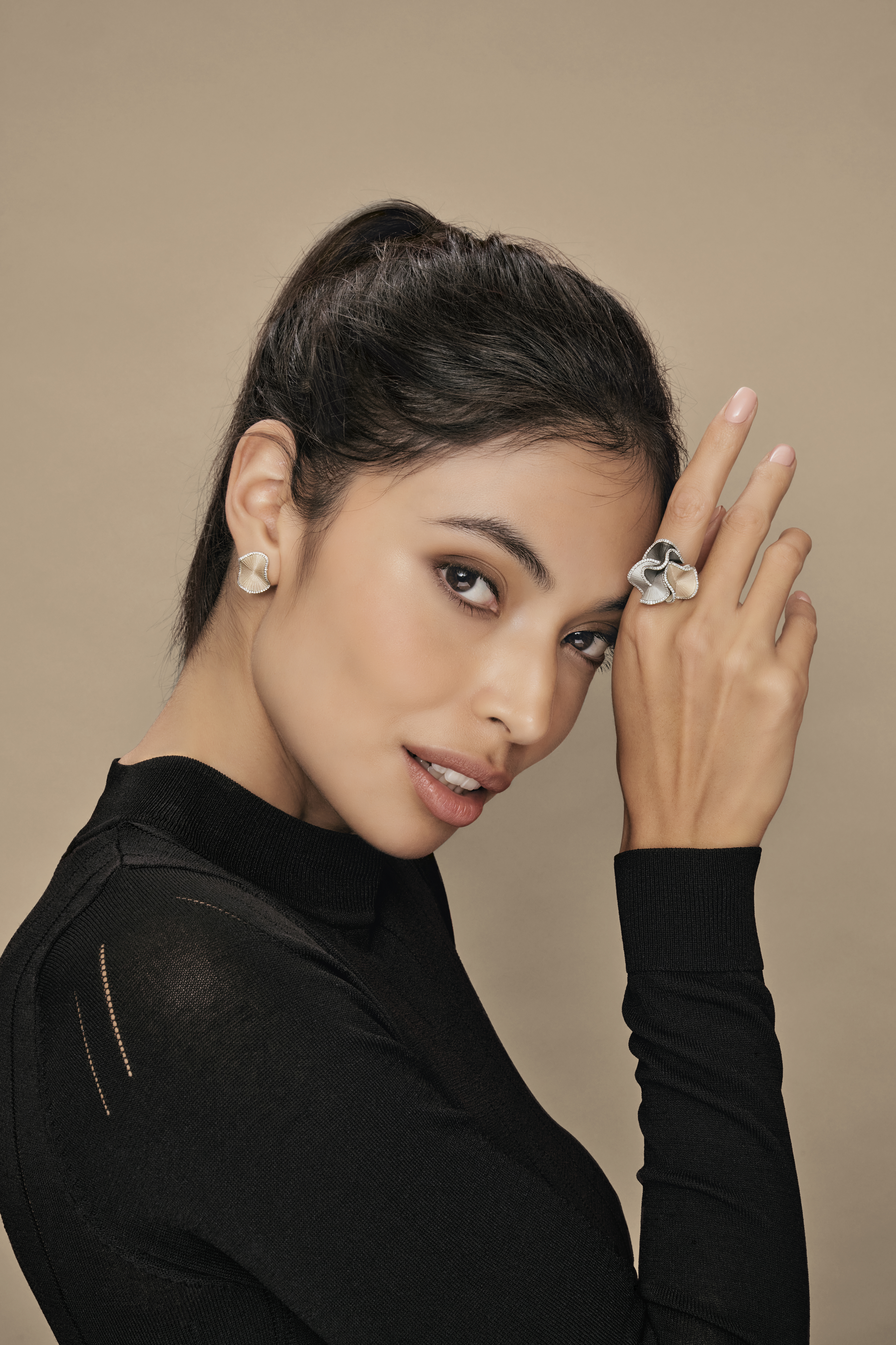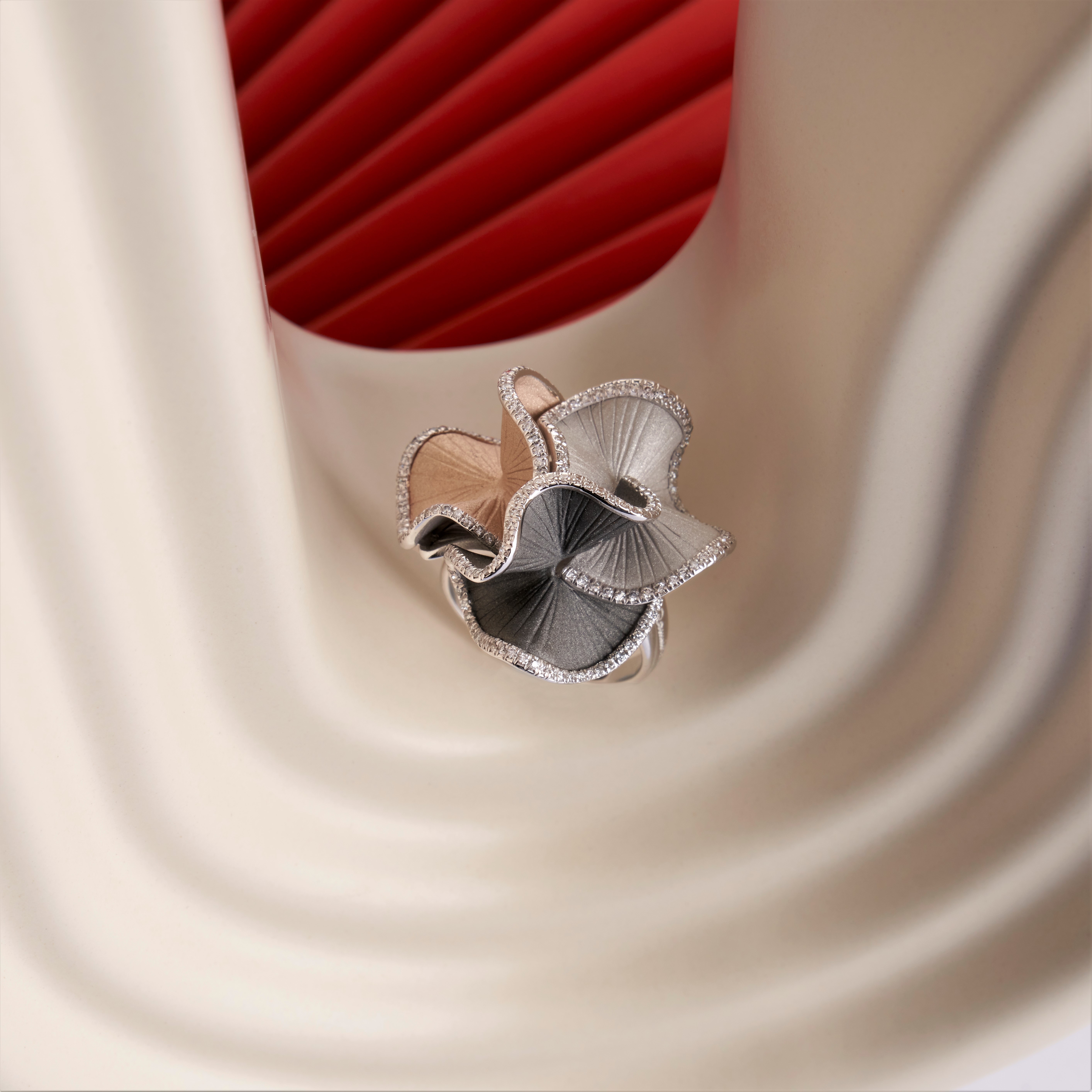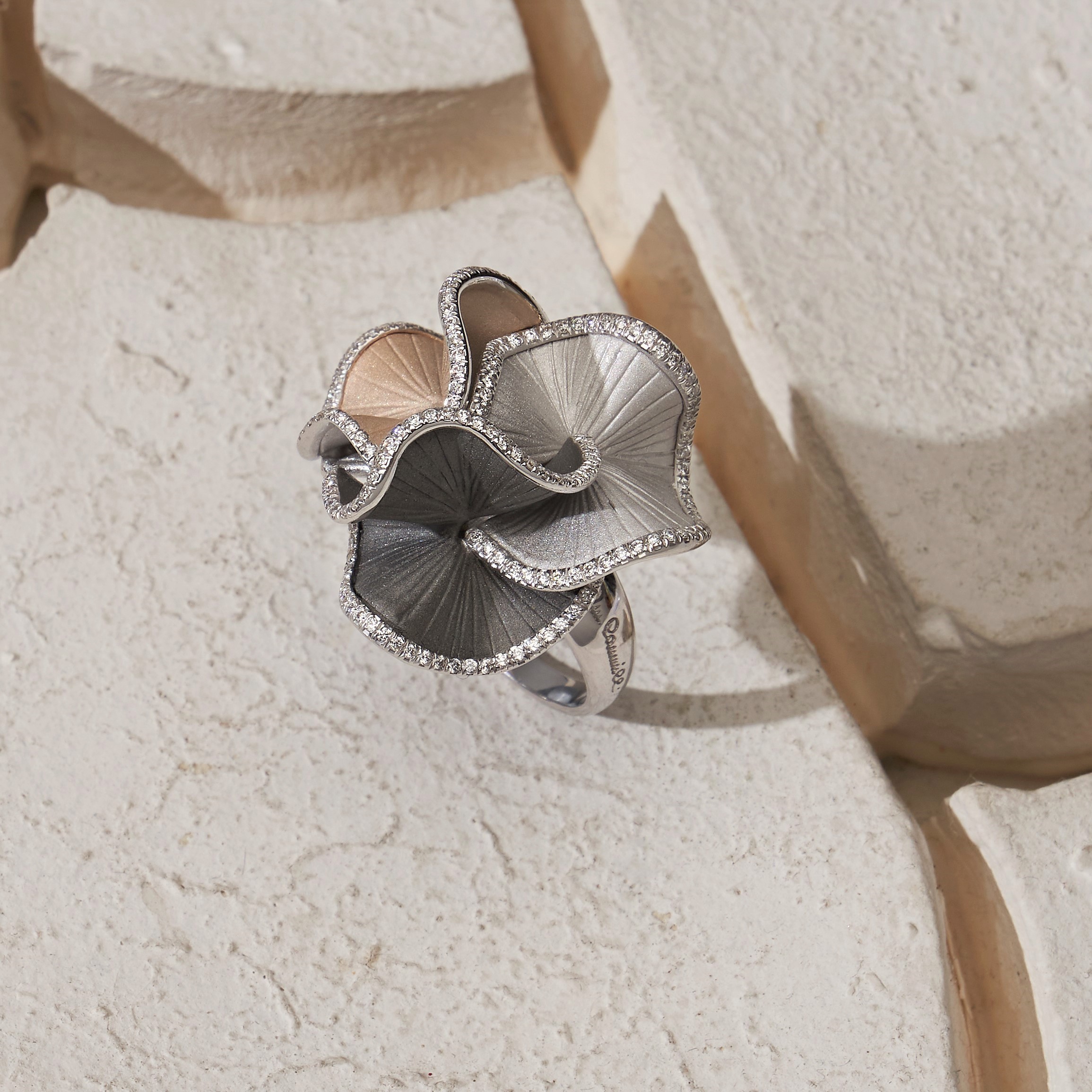 In de ontwerpen van Annamaria Cammilli zien we naast creativiteit ook het vakmanschap van de goudsmid. De driedimensionaliteit van de vormen wordt versterkt door de afwisseling tussen de gepolijste oppervlakken en de speciale fluweelachtige afwerking van goud. Deze eigen Aetherna afwerkingsmethode geeft de juwelen van Cammilli een zijdezacht uiterlijk. Bijzonder zijn ook de beroemde acht kleuren goud van Cammilli. Dit is een hulpmiddel om de creatieve mogelijkheden uit te breiden door met verschillende tinten te spelen, en tegelijkertijd elke vrouw de nuance te laten kiezen die het beste bij haar persoonlijkheid en huidskleur past. De Sultana serie is uniek binnen de collectie van Annamaria Cammilli. Deze ring is uitgevoerd in 3 verschillende kleuren goud, en zijn als waaiervormen met elkaar verweven. White Ice, Natural Beige en Black Lava gold, speciale gouden legeringen, ontworpen door Annamaria Cammilli. De ring is op de randen versierd met diamanten.