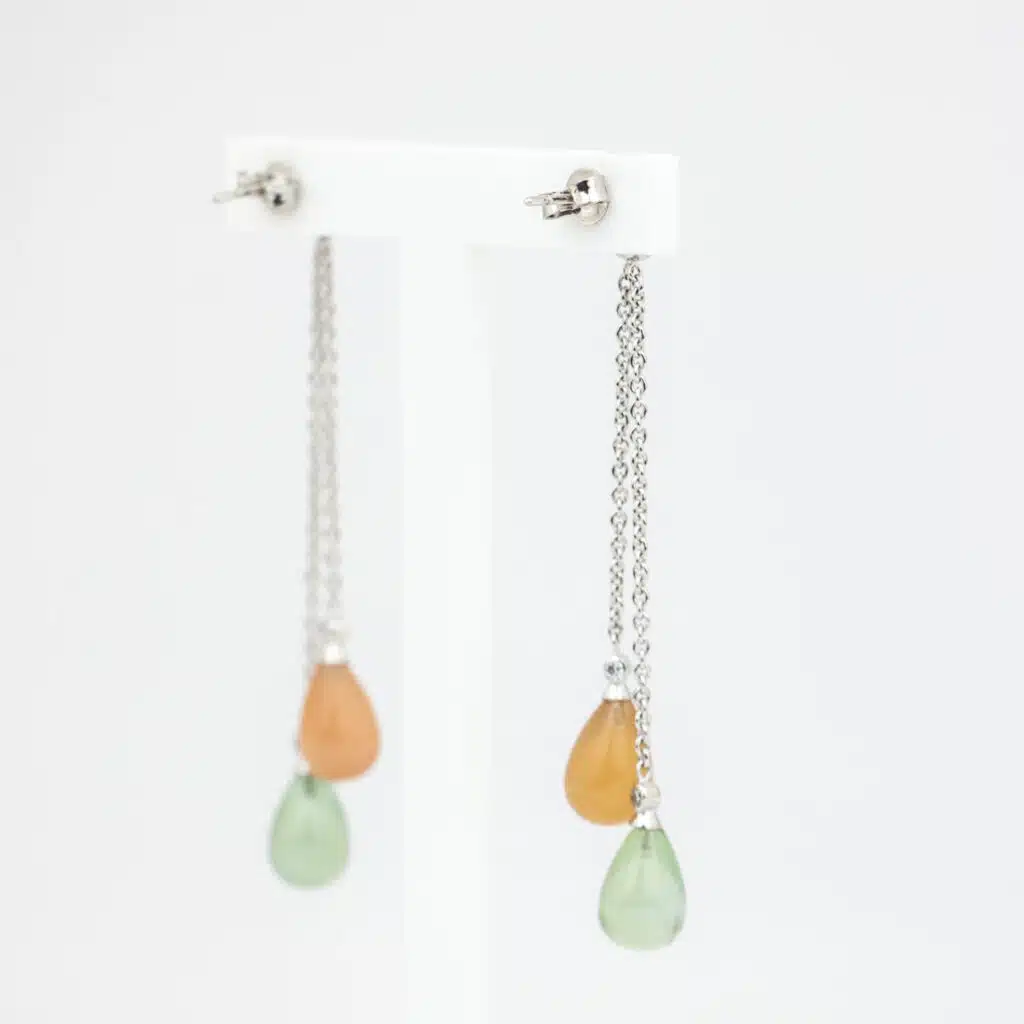 Prachtige 18 karaat witgouden oorhangers van Artur Scholl. Prehniet en oranje maansteen hangen in de vorm van druppels onder het witgouden kettinkje. Boven de edelsteen is een briljant geslepen diamant gezet. De totale lengte van deze oorhanger is 6,5 cm.