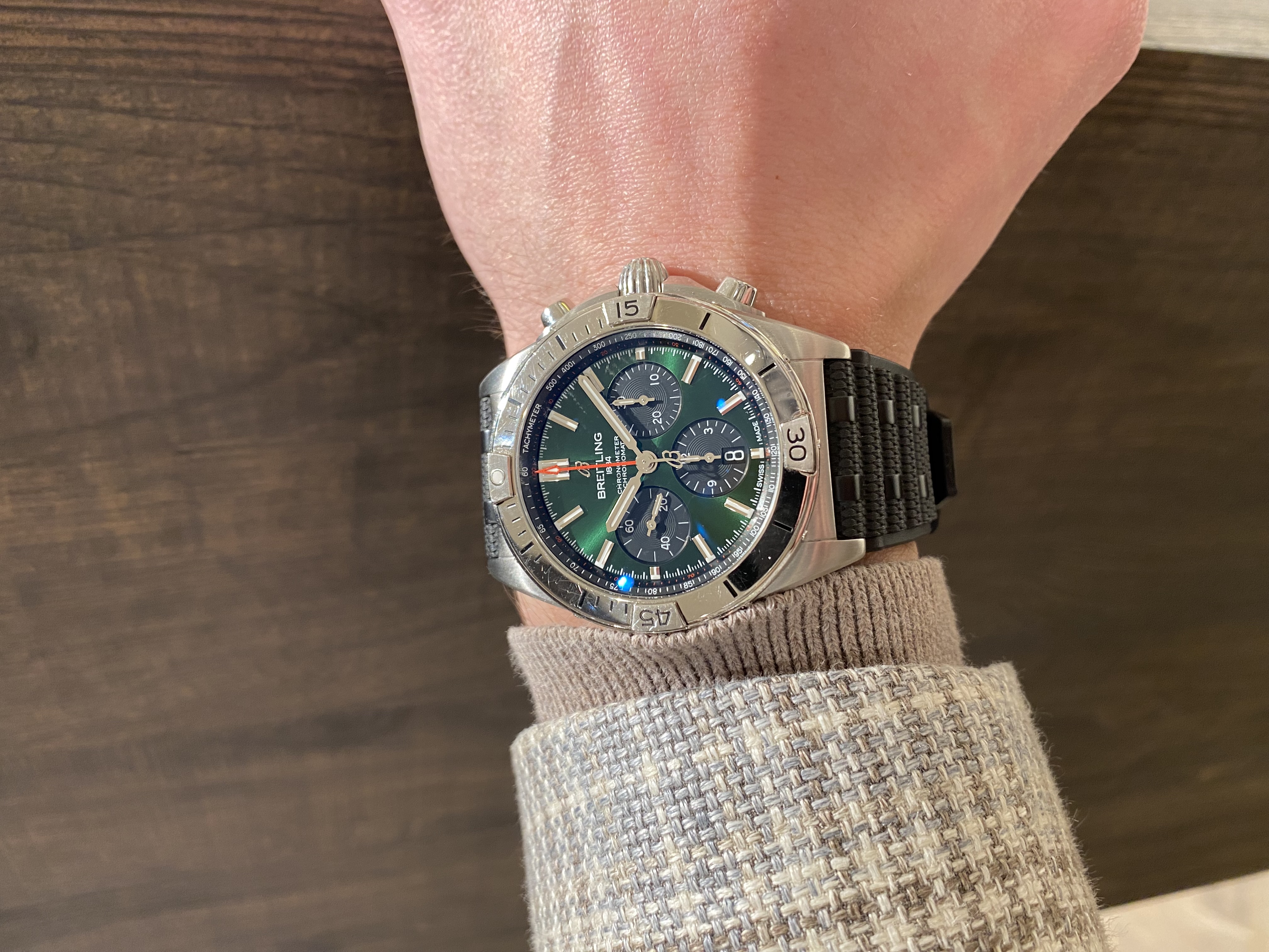 Deze stijvolle, sportieve Breitling Chronomat is een herinterpretatie van de iconische Chronomat uit 1984. Het horloge heeft een edelstalen kast met een diameter van 42 millimeter. De zwarte subsdails vormen een mooi contrast op de donkergroene wijzerplaat. De Tachymeter is af te lezen in de zwart gekleurde ring. Net als de icoon uit de jaren '80 heeft ook deze Breitling een robuuste Rouleaux horlogeband die zeer comfortabel aanvoelt om de pols. De verwisselbare rijder tabs maken een count-down of een count-up functie mogelijk. Aangedreven door Breitling’s Manufacture Calibre 01, is deze COSC-gecertificeerde chronometer waterbestendig tot 20 bar (200 meter).