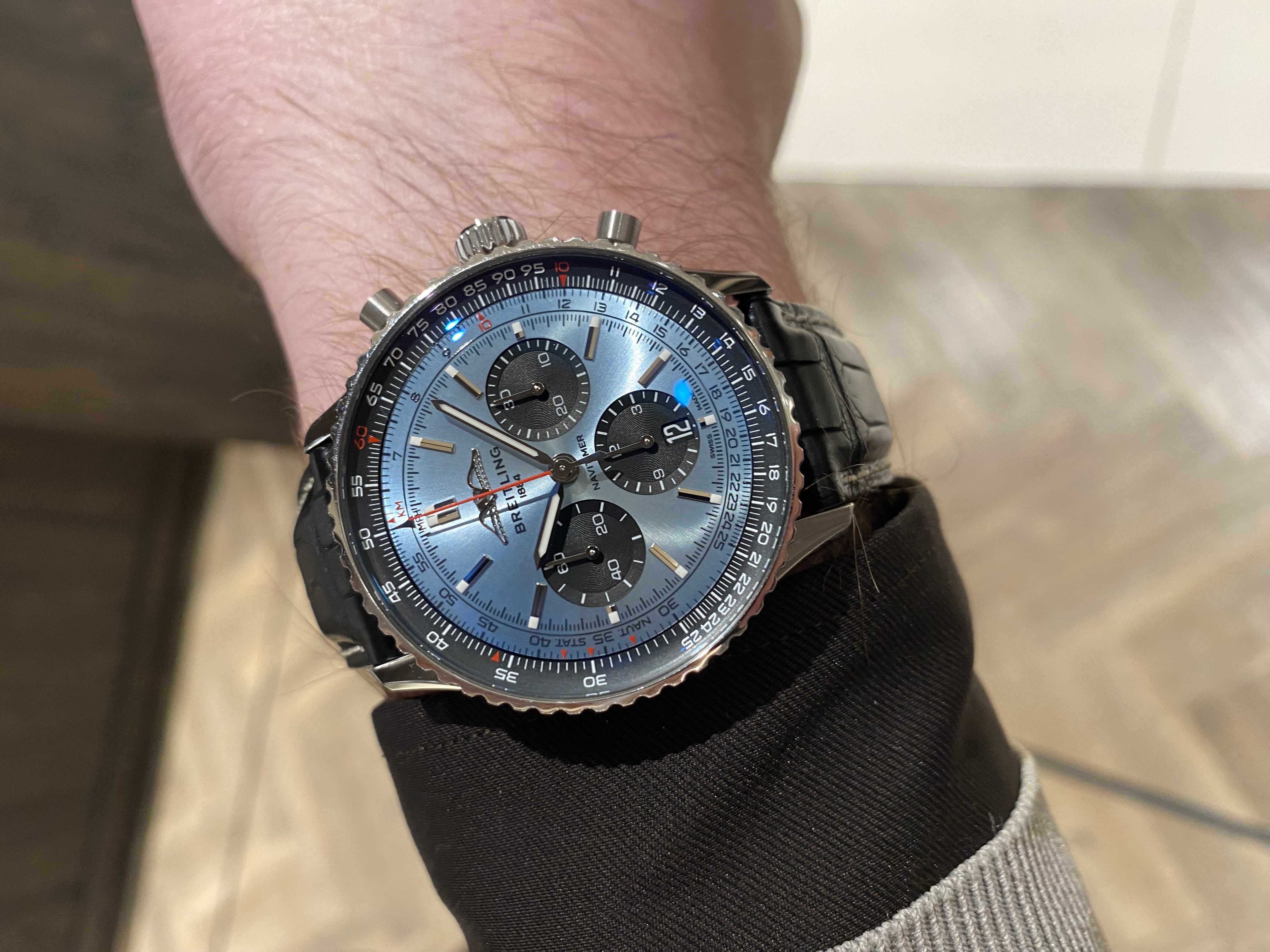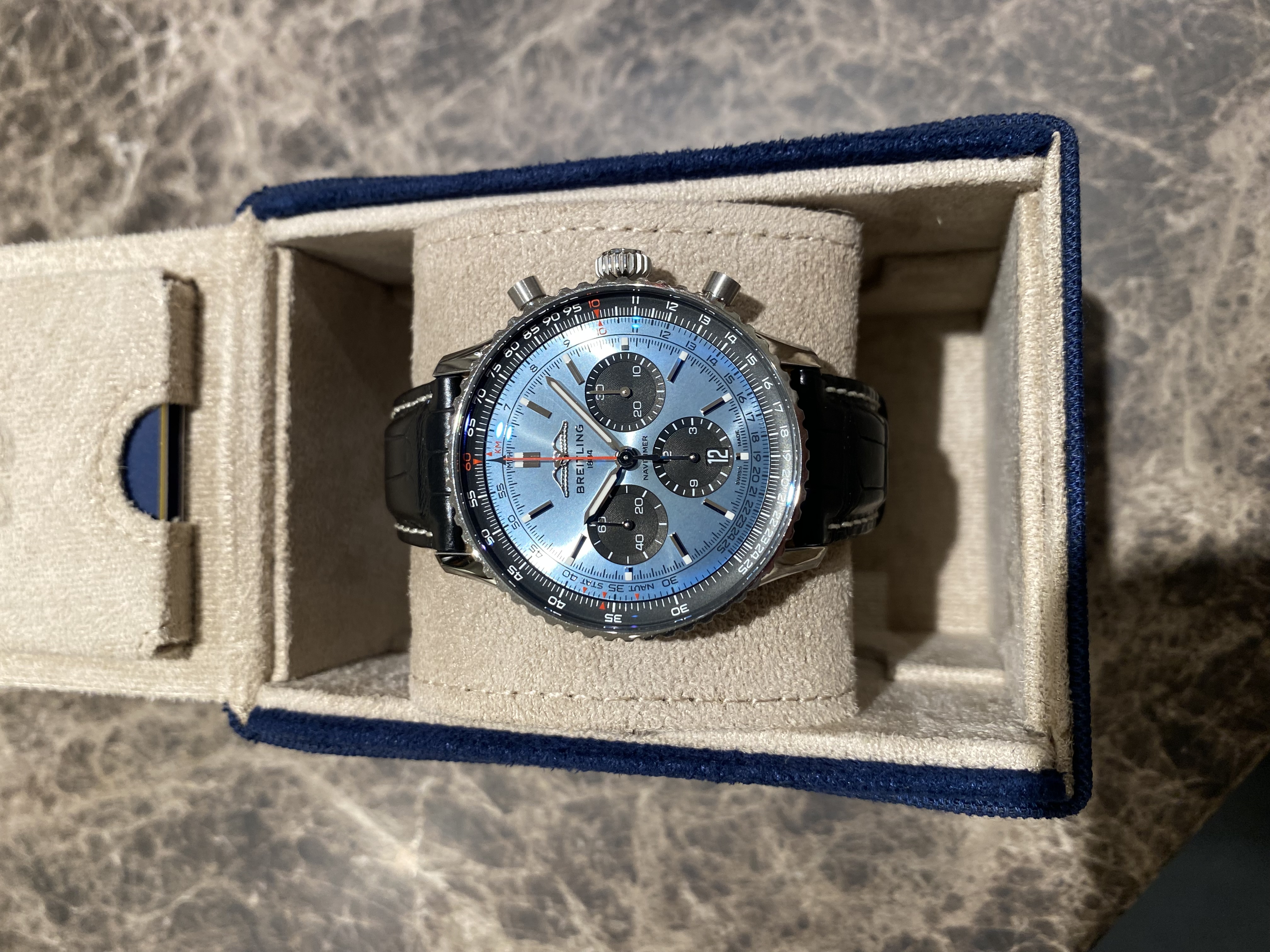 In 1952 ontwikkelde Willy Breitling een om de pols gedragen chronograaf met een cirkelvormige rekenliniaal waarmee piloten alle benodigde vluchtberekeningen konden uitvoeren. Twee jaar later kondigde de Aircraft Owners and Pilots Association (AOPA) het ontwerp aan als officieel uurwerk. De “navigatietimer” – of Navitimer – was geboren. De AOPA was (en blijft) de grootste pilotenclub ter wereld, met bijna alle Amerikaanse vliegeniers in de gelederen. Als het echte pilotenhorloge tijdens de gloriedagen van de burgerluchtvaart, werd de Navitimer gedragen door kapiteins van luchtvaartmaatschappijen en vliegtuigenthousiastelingen. Het vond zelfs zijn weg naar de ruimte om de pols van astronaut Scott Carpenter in 1962. En het waren niet alleen piloten die aangetrokken werden door de onstuitbare esthetiek van het horloge. Beroemdheden uit die tijd zoals Miles Davis en Serge Gainsbourg waren toegewijden, wat aantoont dat de Navitimer zowel stijl als functie had. Er zijn veel herhalingen van Breitling’s icoon geweest sinds zijn debuut 70 jaar geleden, maar deze nieuwe Navitimer legt de meest klassieke functies vast en verbetert ze met moderne verfijningen.