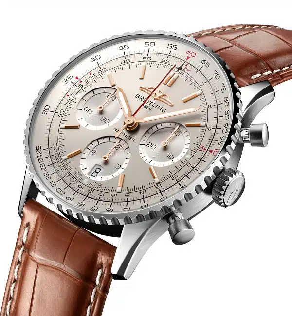 In 1952 ontwikkelde Willy Breitling een om de pols gedragen chronograaf met een cirkelvormige rekenliniaal waarmee piloten alle benodigde vluchtberekeningen konden uitvoeren. Twee jaar later kondigde de Aircraft Owners and Pilots Association (AOPA) het ontwerp aan als officieel uurwerk. De “navigatietimer” – of Navitimer – was geboren. De AOPA was (en blijft) de grootste pilotenclub ter wereld, met bijna alle Amerikaanse vliegeniers in de gelederen. Als het echte pilotenhorloge tijdens de gloriedagen van de burgerluchtvaart, werd de Navitimer gedragen door kapiteins van luchtvaartmaatschappijen en vliegtuigenthousiastelingen. Het vond zelfs zijn weg naar de ruimte om de pols van astronaut Scott Carpenter in 1962. En het waren niet alleen piloten die aangetrokken werden door de onstuitbare esthetiek van het horloge. Beroemdheden uit die tijd zoals Miles Davis en Serge Gainsbourg waren toegewijden, wat aantoont dat de Navitimer zowel stijl als functie had. Er zijn veel herhalingen van Breitling’s icoon geweest sinds zijn debuut 70 jaar geleden, maar deze nieuwe Navitimer legt de meest klassieke functies vast en verbetert ze met moderne verfijningen.
