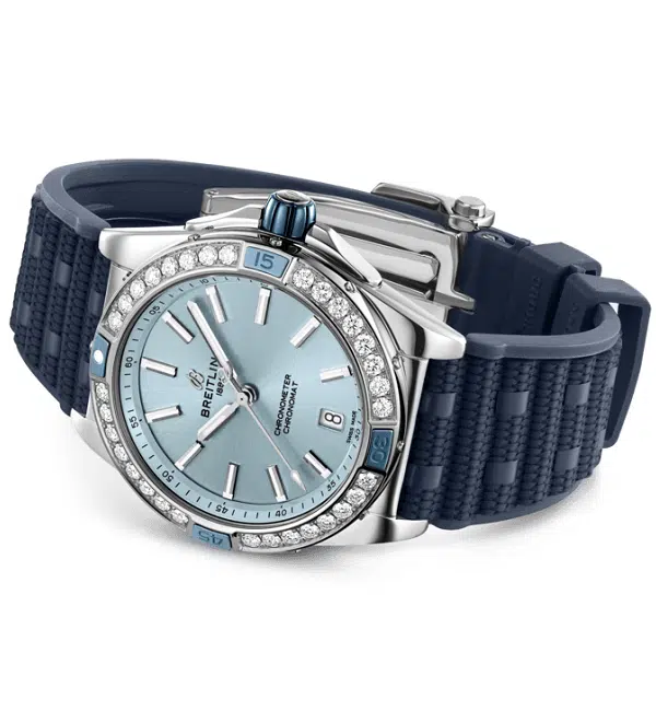 Deze Breitling Super Chronomat Automatic 38 is ontworpen om een statement te maken, of hij nu wordt gecombineerd met een stijlvol pak of een T-shirt en jeans. De blauw rubberen rouleaux horlogeband en de blauw keramische 'rider tabs' en kroon geven dit horloge een sportieve uitstraling. De 32 diamanten die schitteren in de lunette zorgen voor de juiste hoeveelheid elegantie. Aangedreven door Breitling’s Caliber B17, is deze COSC-gecertificeerde chronometer waterbestendig tot 10 bar (100 meter).