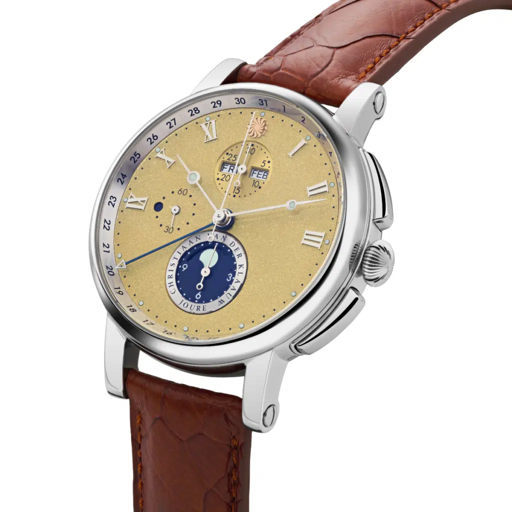 De prachtige Hypernova van Christiaan van der Klaauw is er nu ook met een yellowgold Givrée wijzerplaat. In de wijzerplaat zit een prachtige, subtiele schittering. Dit horloge combineert een chronograaf met een dag/nacht aanduiding, een vernuftige dag-, datum-, en maandaanduiding en een fraaie maanstand indicatie. Deze maanstand-indicatie is op de 6-uurs positie af te lezen. Wanneer de maan links van het midden staat bevindt de maan zich in het eerste kwartier. Wanneer de beeltenis in het midden staat is het volle maan en aan de rechterkant van het midden bevindt de maan zich in het laatste kwartier. Indien de maan niet zichtbaar is ziet men in het venster een prachtige sterrenhemel en is het nieuwe maan. De Hypernova heeft een mooie, afgeronde horlogekast met een diameter van 44 millimeter.