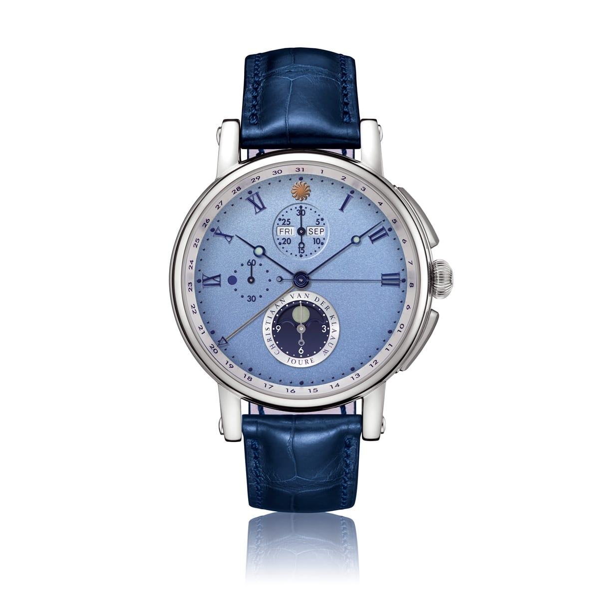 De prachtige Hypernova van Christiaan van der Klaauw is er nu ook met een Light blue Givrée wijzerplaat. In de wijzerplaat zit een prachtige, subtiele schittering. Dit horloge combineert een chronograaf met een dag/nacht aanduiding, een vernuftige dag-, datum-, en maandaanduiding en een fraaie maanstand indicatie. Deze maanstand-indicatie is op de 6-uurs positie af te lezen. Wanneer de maan links van het midden staat bevindt de maan zich in het eerste kwartier. Wanneer de beeltenis in het midden staat is het volle maan en aan de rechterkant van het midden bevindt de maan zich in het laatste kwartier. Indien de maan niet zichtbaar is ziet men in het venster een prachtige sterrenhemel en is het nieuwe maan. De Hypernova heeft een mooie, afgeronde horlogekast met een diameter van 44 millimeter.
