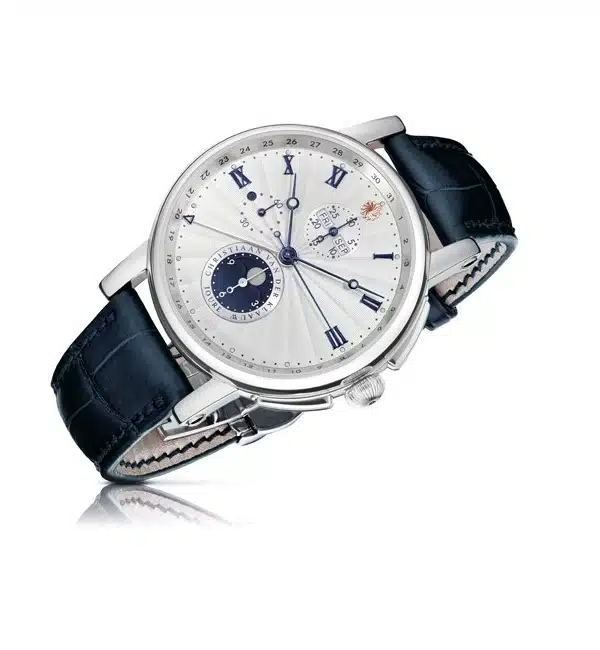 De prachtige Hypernova van Christiaan van der Klaauw. Dit horloge combineert een chronograaf met een dag/nacht aanduiding, een vernuftige datumaanduiding en een fraaie maanstand indicatie. Deze maanstand indicatie is op de 6-uurs positie af te lezen. Wanneer de maan links van het midden staat bevindt de maan zich in het eerste kwartier. Wanneer de beeltenis in het midden staat is het volle maan en aan de rechterkant van het midden bevindt de Maan zich in het laatste kwartier. Indien de maan niet zichtbaar is ziet men in het venster een prachtige sterrenhemel en is het nieuwe Maan. De CVDK Hypernova is het eerste model in de collectie van CVDK met onze nieuwe extra grote kast, met een diameter van 44 millimeter.