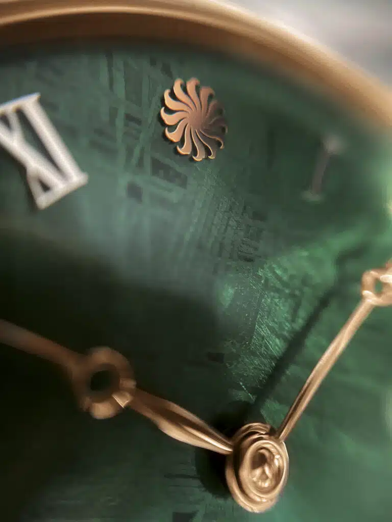 Christiaan van der Klaauw is een uniek atelier. Het atelier vervaardigd uitsluitend horloges met astronomische complicaties. Christiaan begon zijn carrière met maken van klokken in 1974. Deze klokken hadden toen al astronomische functies. In de jaren 90 werden hier polshorloges aan toegevoegd. Dit spectaculaire horloge is gemaakt van 18 karaat roségoud en heeft een groene meteoriet wijzerplaat. Dit maakt een waanzinnige harmonie tussen zowel de aard van de functie als het materiaal gebruik. Het horloge wordt aangedreven door het eerste in-house vervaardigde uurwerk van het atelier. Een waar meesterstuk.