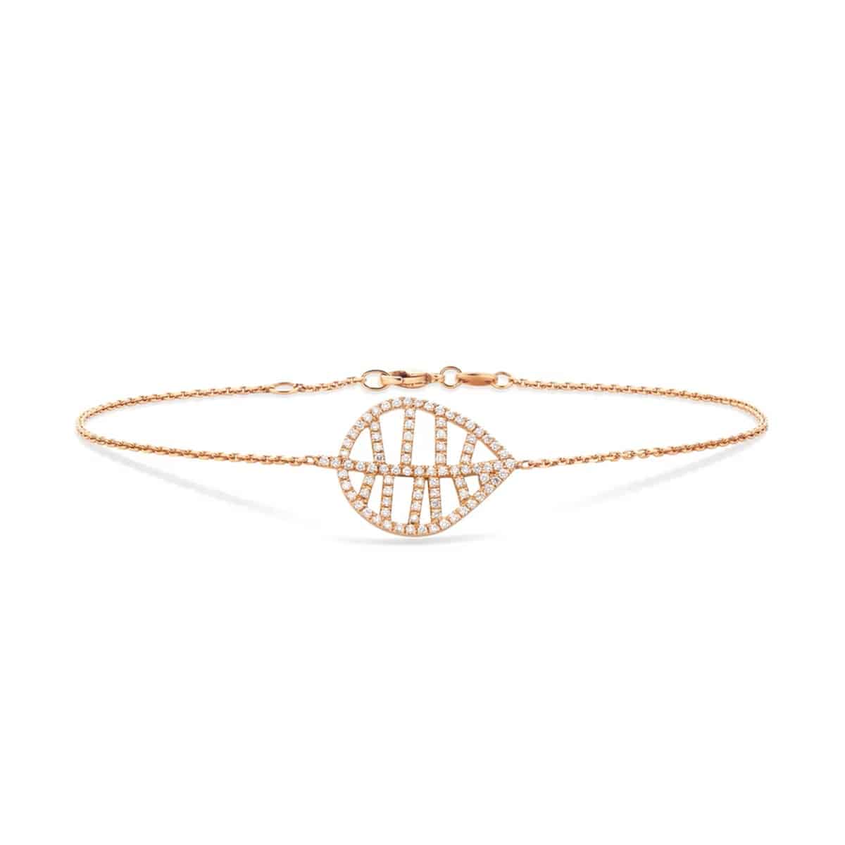 Deze verfijnde armband van 18 karaats roségoud is pavé bezet met sprankelende diamanten en schittert subtiel om de pols. Het grafische ontwerp, geïnspireerd op de sierlijke vorm van een blad, weerspiegelt de fascinatie van de ontwerper voor de organische patronen van het bos. Elk detail ademt vakmanschap en verwondering – een tijdloos sieraad dat natuur en elegantie harmonieus samenbrengt. Afmetingen: 2 cm x 1,5 cm