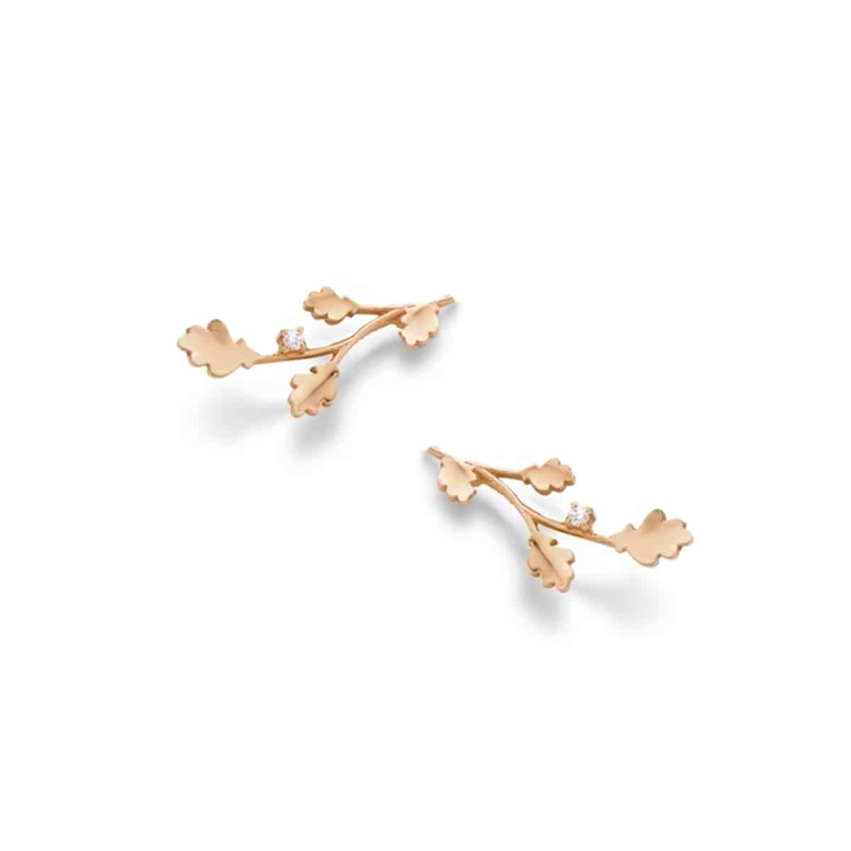 Deze prachtige 18 karaat roségouden oorstekers volgen heel mooi de ronding van het oor en creëren een opvallend silhouet. Geïnspireerd door de delicate vorm van een eikentakje, is het sieraad versierd met een schitterende diamant, waardoor de schoonheid van de natuur tot leven komt in een sieraad. Prinses Margarita de Bourbon de Parme haalt eindeloze inspiratie uit de patronen van bladeren en takken in het bos en vertaalt deze naar tijdloze kunst. Deze oorsteker is de perfecte combinatie van elegantie en natuur en biedt een unieke en verfijnde touch. Afmetingen: 2.2 cm x 0.8 cm