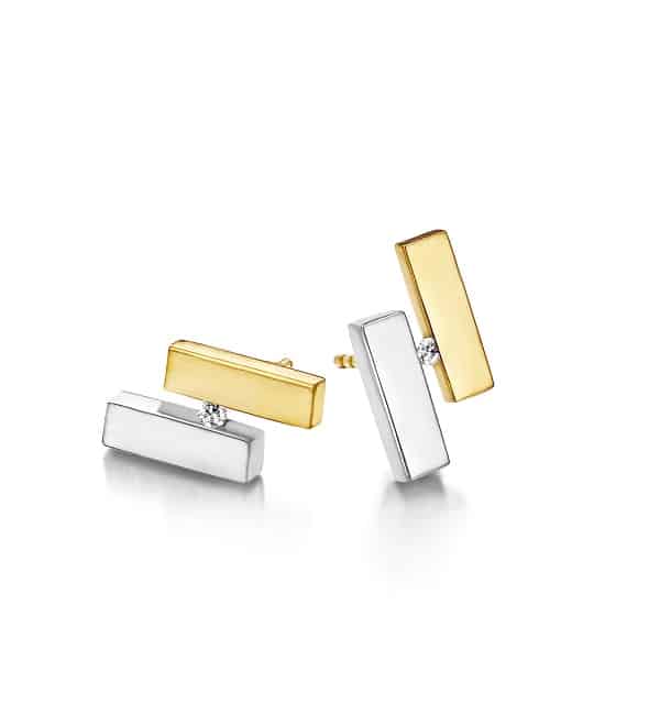 Deze prachtige oorknoppen van het merk Fjory zijn modern vormgegeven. Tussen de twee banen van geelgoud en witgoud (met een kern van zilver) schittert een briljant geslepen diamant. De diamanten in deze oorknoppen zijn per oorsteker 0,02 karaat, totaal 0,04 karaat. Maak deze look helemaal af door bij deze oorknoppen het bijpassende collier, armband of ring te dragen.