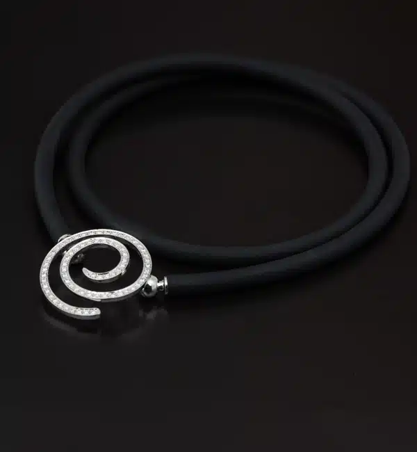 Casual Caoutchouc collier met stalen eindstukken van Jörg Heinz. Flexibel, licht en dus prettig draagbaar. Mooi in combinatie met bijvoorbeeld de staal/gouden bolsluiting “Meridian” of model “Stardust”van Jörg Heinz. Lengte 42cm.