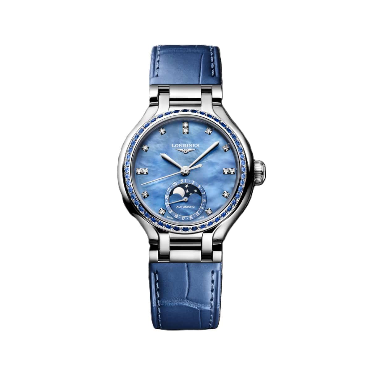 Maak kennis met dit stijlvolle model van Longines, de PrimaLuna Moonphase. De sierlijk vormgegeven edelstalen kast met een diameter van 34 mm is voorzien van 48 fonkelende blauwe saffieren, wat het horloge een elegante en vrouwelijke uitstraling geeft. Op de blauw parelmoer wijzerplaat worden de datum en de maanfase op prachtige wijze weergegeven, terwijl 14 briljant geslepen diamanten extra schittering toevoegen. In het hart van de PrimaLuna Moonphase tikt een Zwitsers automatisch uurwerk met een indrukwekkende gangreserve van 72 uur.