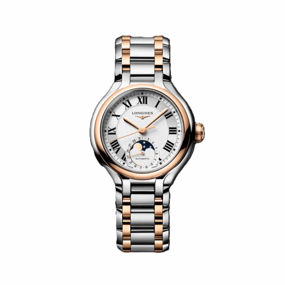 Maak kennis met dit stijlvolle model van Longines, de PrimaLuna Moonphase. Dit horloge straalt pure elegantie uit met haar 34 millimeter edelstalen kast en 18 karaat roségouden accenten. Op de zilverkleurige wijzerplaat worden de datum en de maanfase op prachtige wijze weergegeven. In het hart van de PrimaLuna Moonphase tikt een Zwitsers automatisch uurwerk met een gangreserve van maar liefst 72 uur.