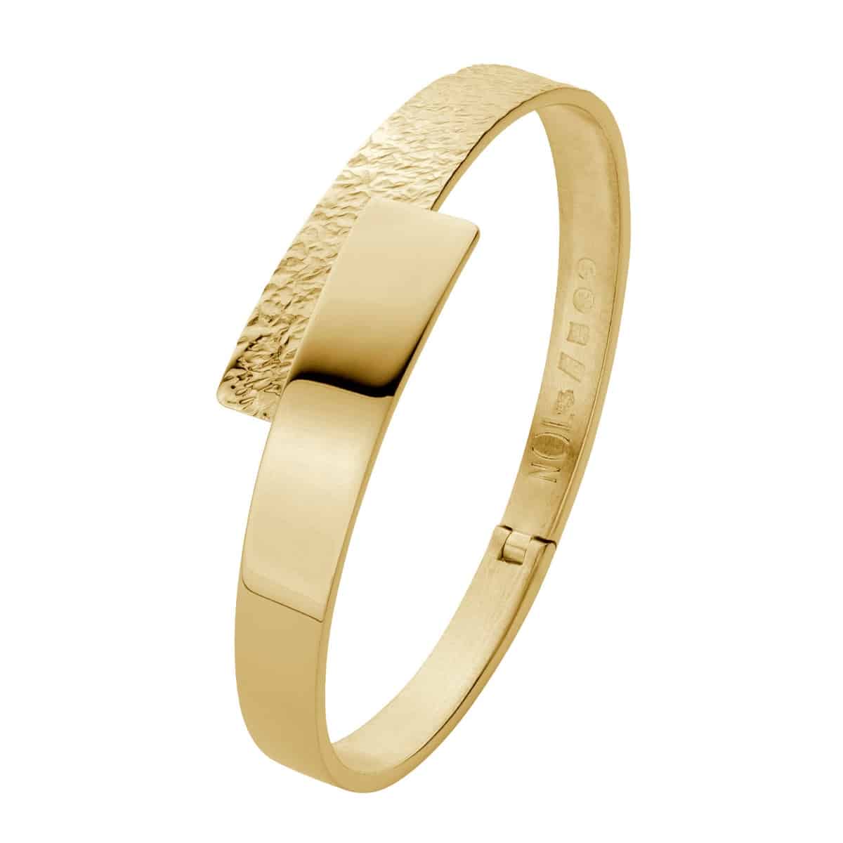 Een krachtig statement in goud. Deze armband is vervaardigd uit 14 karaat geelgoud en toont de perfecte balans tussen strakke, moderne vormgeving en verfijnde ambacht. Het ontwerp speelt met contrast: een deel is strak gepolijst en glanst als vloeibaar goud, terwijl het andere deel een subtiele hamerslag draagt – een handmatig aangebrachte structuur die het licht sprankelend vangt. Minimalistisch in lijn, maar rijk in expressie.