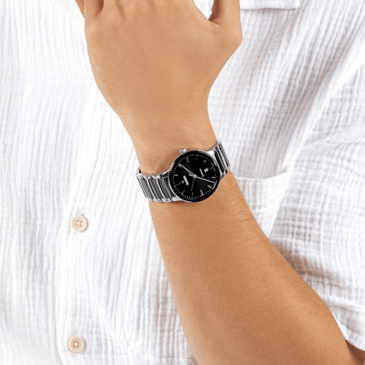 De klassieke Rado Centrix Automatic is zowel technisch als esthetisch vernieuwd. Het horloge heeft nu een afgerond saffierglas dat naadloos overgaat in de gebogen kast, met verfijnde kastpootjes en een band van gepolijst roestvrij staal met zwarte high-tech keramische schakels. De zwarte sunray-wijzerplaat met rhodiumkleurige indexen en wijzers geeft een elegante uitstraling. Binnenin zorgt het automatische R763-uurwerk, met antimagnetische Nivachron™ balansveer, voor hoge precisie en betrouwbaarheid. Het horloge biedt een gangreserve van 80 uur en is waterbestendig tot 50 meter.