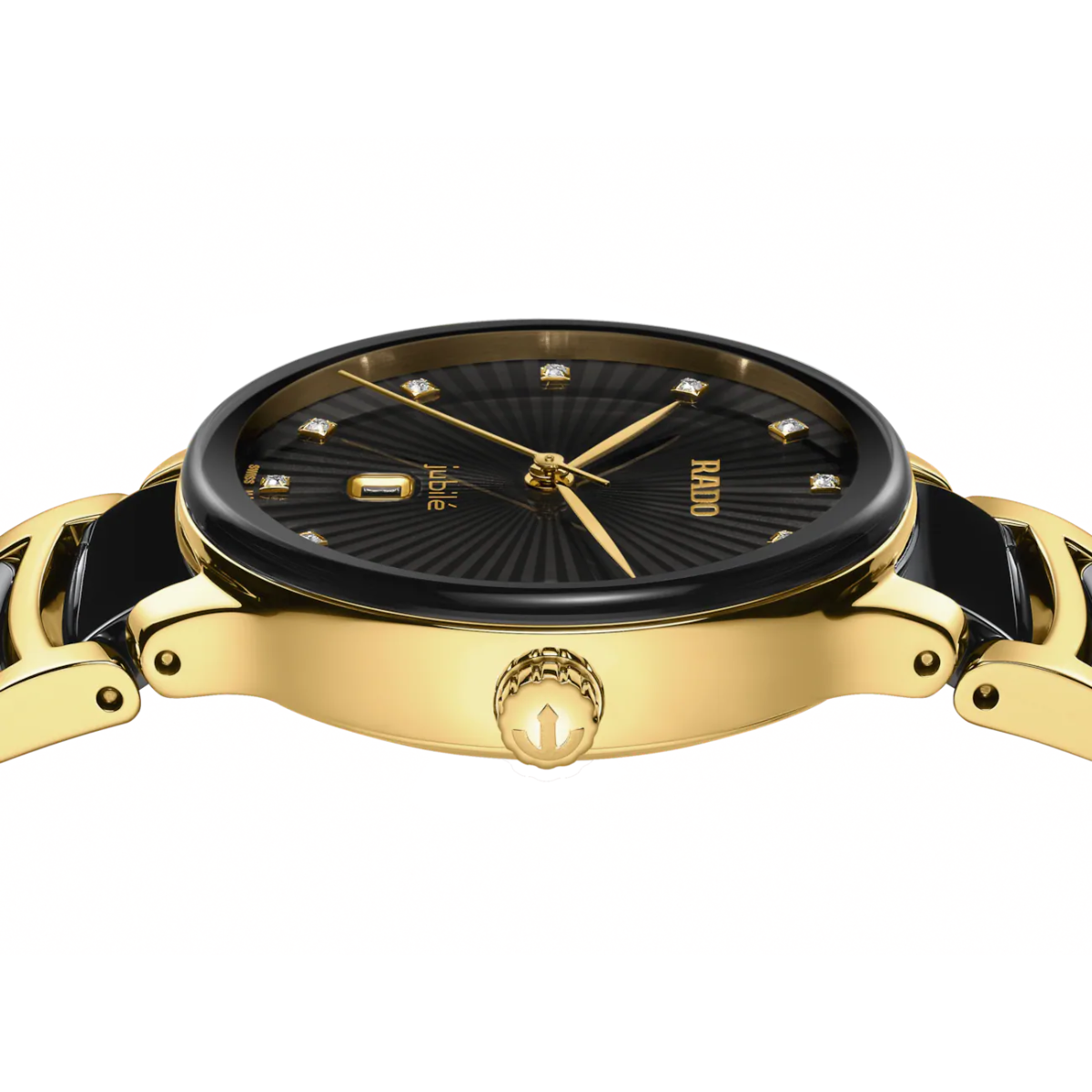 De Rado Centrix Diamonds straalt tijdloze elegantie uit in een verfijnde combinatie van geelgoudkleurig PVD-roestvrij staal en zwarte high-tech keramiek. De 30,5 mm kast omlijst een diepzwarte wijzerplaat, subtiel verrijkt met fonkelende diamanten als uurmarkeringen. Het slanke ontwerp wordt compleet gemaakt door de geïntegreerde armband, die comfort en stijl naadloos samenbrengt. Betrouwbaar, chic en onmiskenbaar Rado – een horloge dat elke outfit verheft.