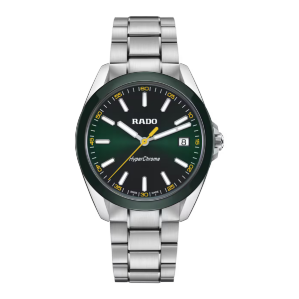 De HyperChrome Quartz combineert precisie, duurzaamheid en stijl. Het horloge heeft een groene keramische bezel, saffierglas, R292 quartz uurwerk met ±10 seconden afwijking per jaar, datumfunctie en een groen sunray-wijzerplaat met Super-LumiNova®. De drie-rijige stalen armband met drievoudige vouwsluiting zorgt voor comfort en een verfijnde uitstraling, terwijl de waterbestendigheid tot 150 m het horloge geschikt maakt voor dagelijks gebruik en avontuurlijke activiteiten.
