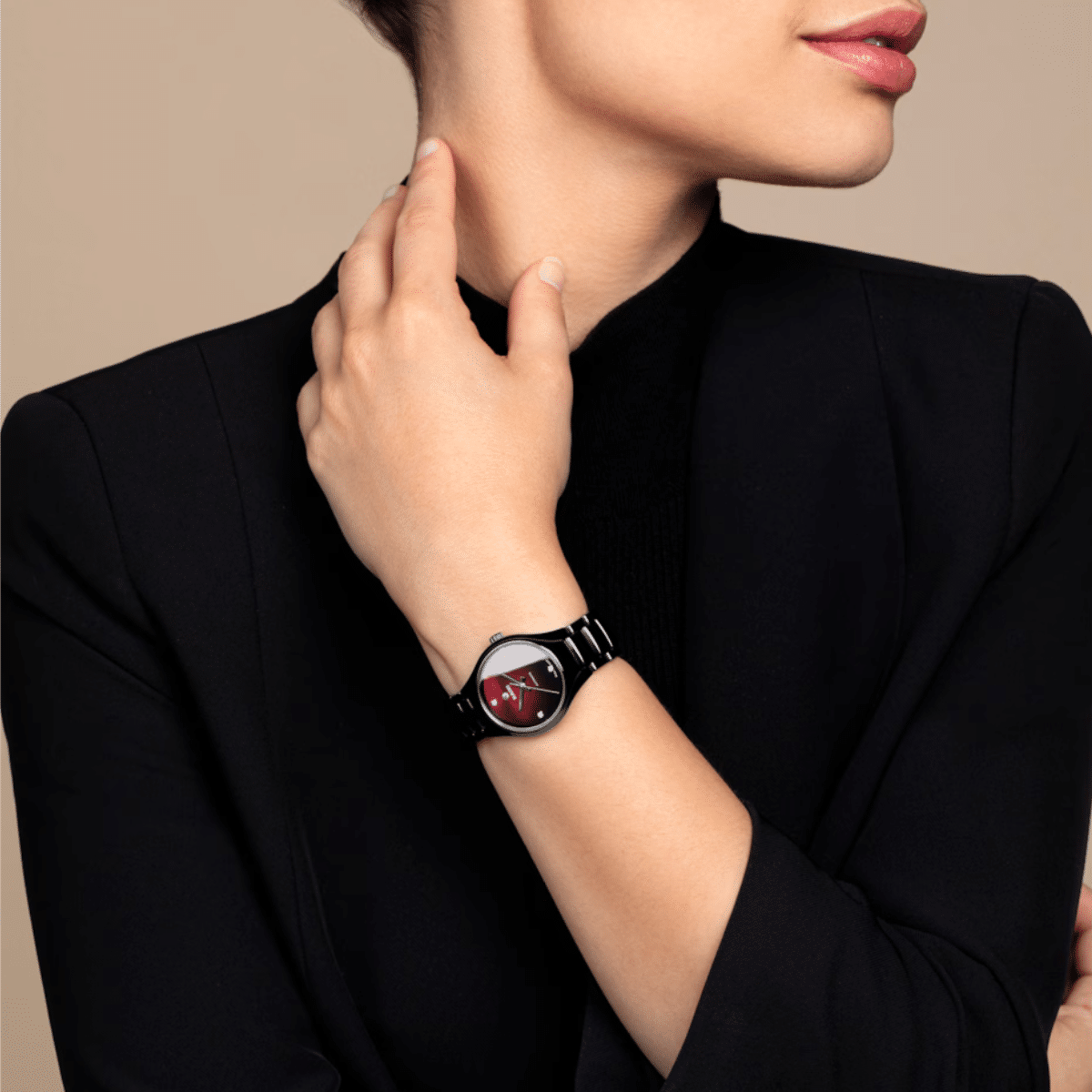 Zelfverzekerde vrouwen beschouwen de Rado True met kersenrode wijzerplaat en vier fonkelende diamanten als een horloge dat elke avondjurk een vleugje glamour geeft. De ronde kast loopt vloeiend over in de armband en, met de fluweelachtige glans van het zwarte hightech keramiek, maakt dit het elegante uiterlijk van het horloge met een diameter van 30 mm compleet.
