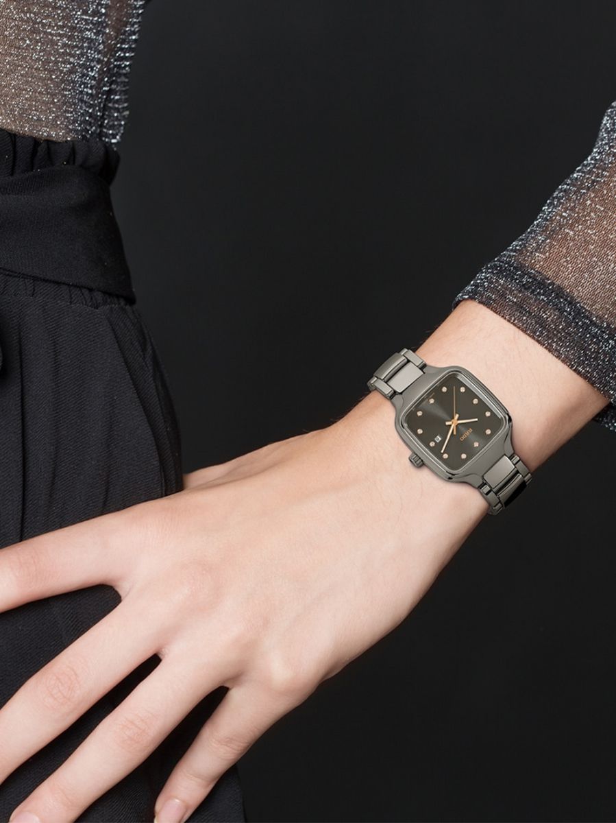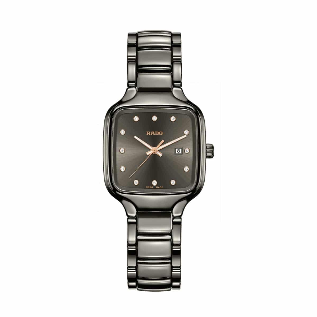 De Rado True Square Diamonds is een moderne interpretatie van Rado’s iconische vierkante design. De monobloc kast van hightech keramiek is licht, krasbestendig en draagt uiterst comfortabel. Op de stijlvolle grijze wijzerplaat schitteren 12 fonkelende diamanten als uurmarkeringen. Het quartz uurwerk zorgt voor nauwkeurige en zorgeloze tijdsweergave. Met zijn strakke lijnen en luxueuze accenten is dit horloge een uitgesproken stijlstatement. Voor wie houdt van design, innovatie en elegantie in één.