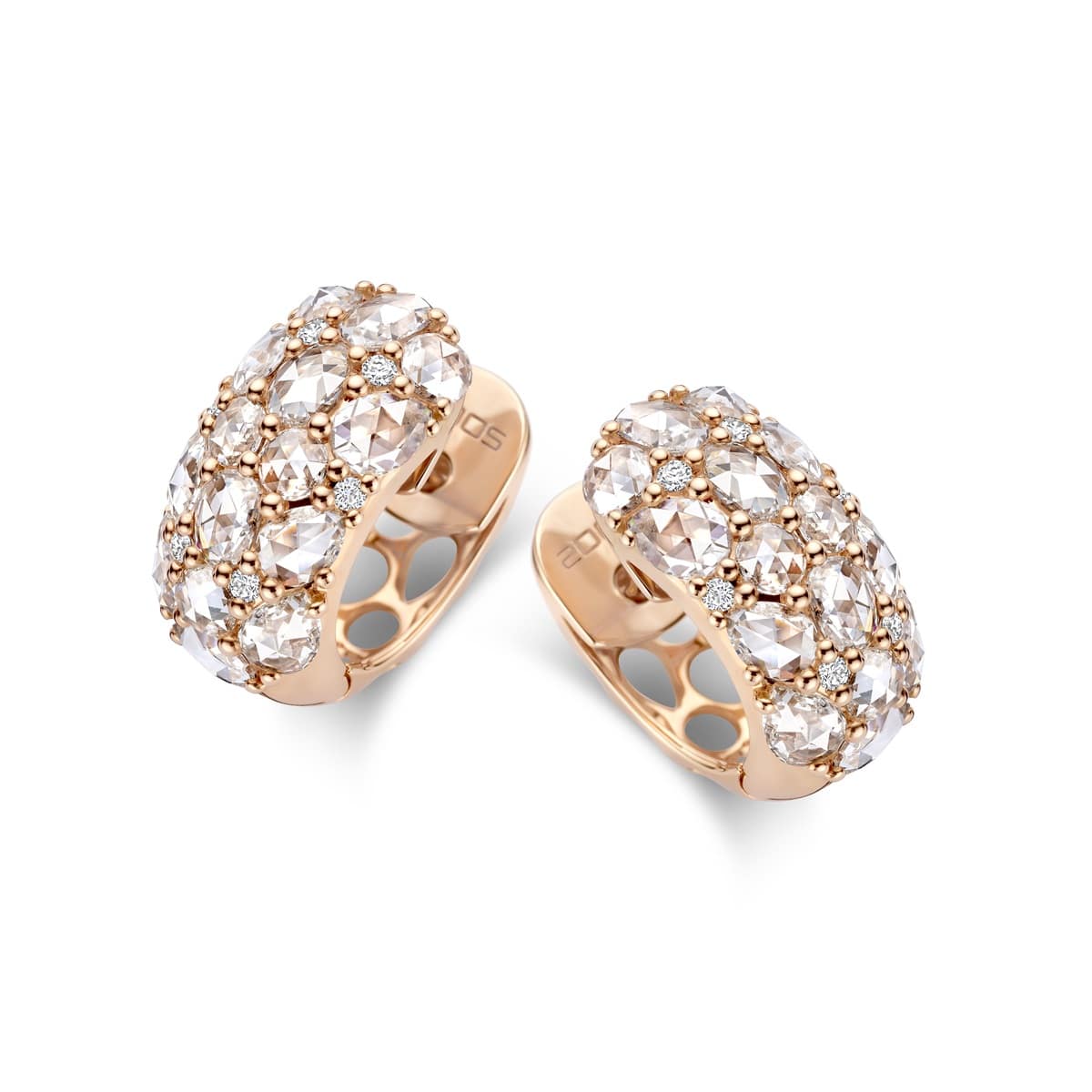 Deze verfijnde oorringen, vervaardigd uit 18 karaat roségoud, omhullen het oor met een warme, elegante gloed. De roosgeslepen diamanten – een traditionele slijpvorm die bekendstaat om zijn subtiele, romantische fonkeling – zijn met zorg in de oorringen gezet en geven het sieraad een zachte, vintage allure.