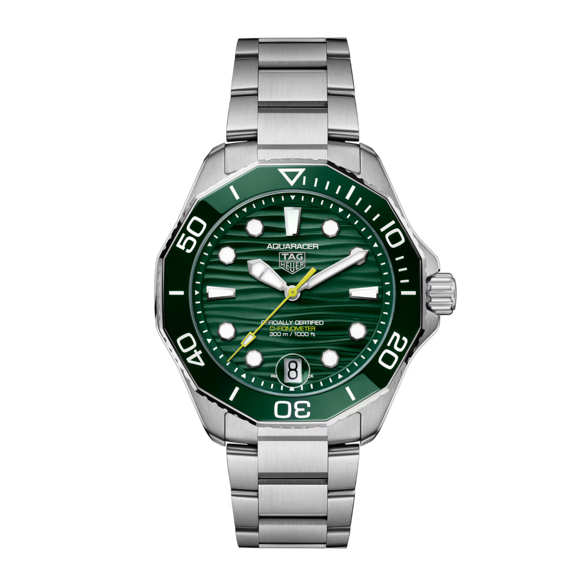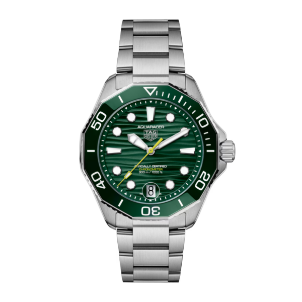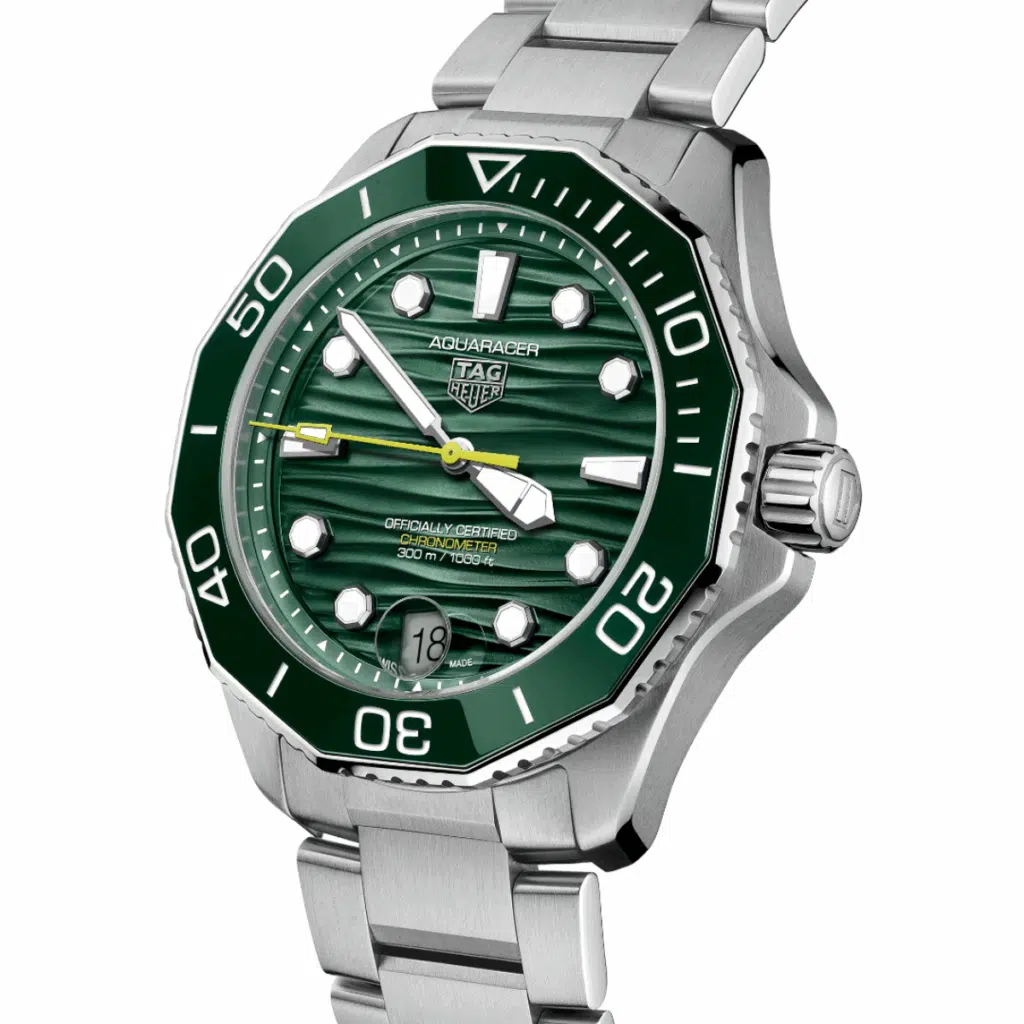 De TAG Heuer Aquaracer Professional 300 Date is ontworpen voor avonturiers die de diepte van de oceaan durven te verkennen. De donkergroene wijzerplaat met golvenpatroon en een opvallende limoengroene secondewijzer verwijzen naar de geheimen van de zee, terwijl de met Super-LumiNova gevulde wijzers en indexen optimale leesbaarheid garanderen, zelfs onder de meest uitdagende omstandigheden. De robuuste, fijngeborstelde en gepolijste stalen kast is voorzien van een groene keramische, eenzijdig draaibare lunette met 60-minutenschaal, die duurzaamheid en gebruiksgemak combineert.