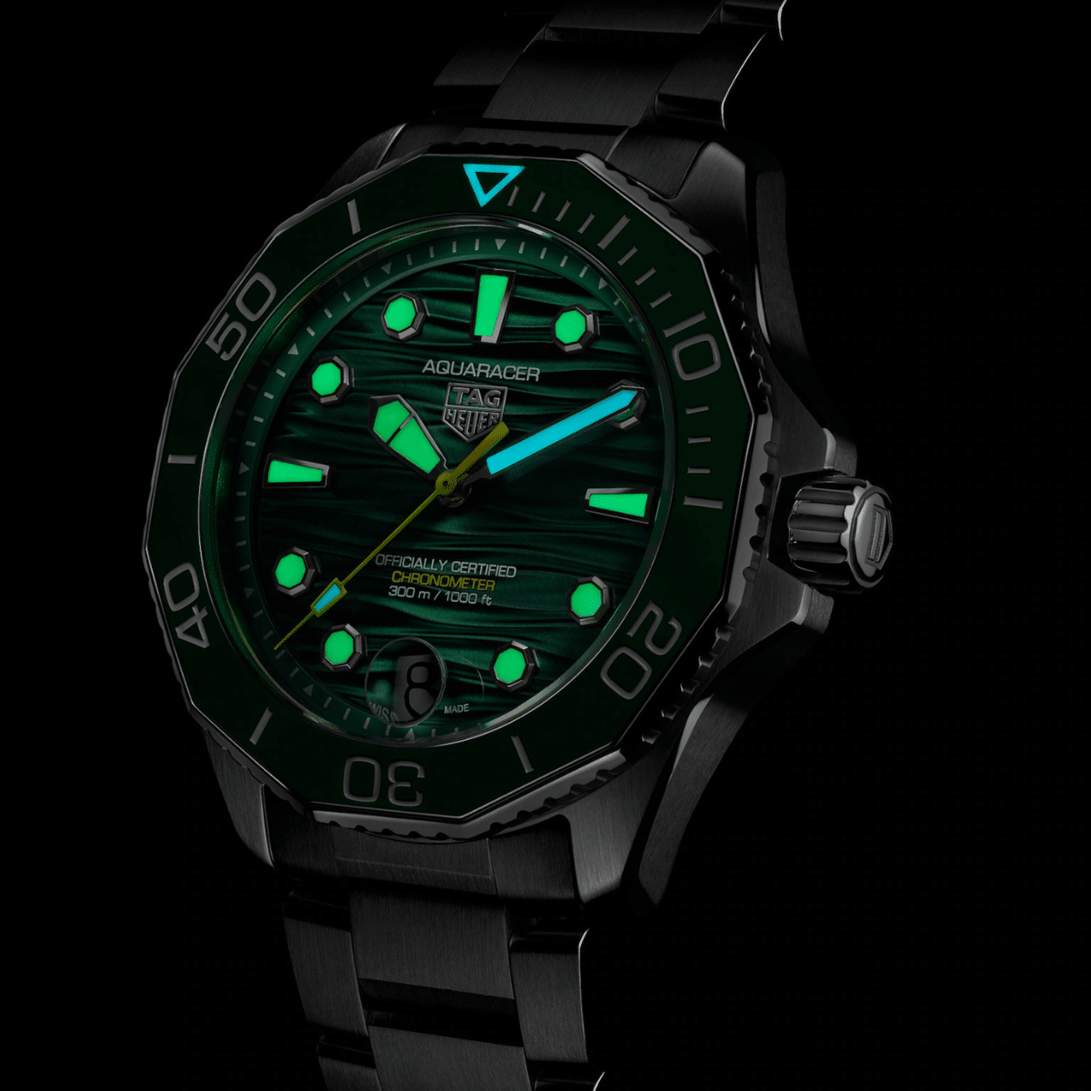 De TAG Heuer Aquaracer Professional 300 Date is ontworpen voor avonturiers die de diepte van de oceaan durven te verkennen. De donkergroene wijzerplaat met golvenpatroon en een opvallende limoengroene secondewijzer verwijzen naar de geheimen van de zee, terwijl de met Super-LumiNova gevulde wijzers en indexen optimale leesbaarheid garanderen, zelfs onder de meest uitdagende omstandigheden. De robuuste, fijngeborstelde en gepolijste stalen kast is voorzien van een groene keramische, eenzijdig draaibare lunette met 60-minutenschaal, die duurzaamheid en gebruiksgemak combineert.