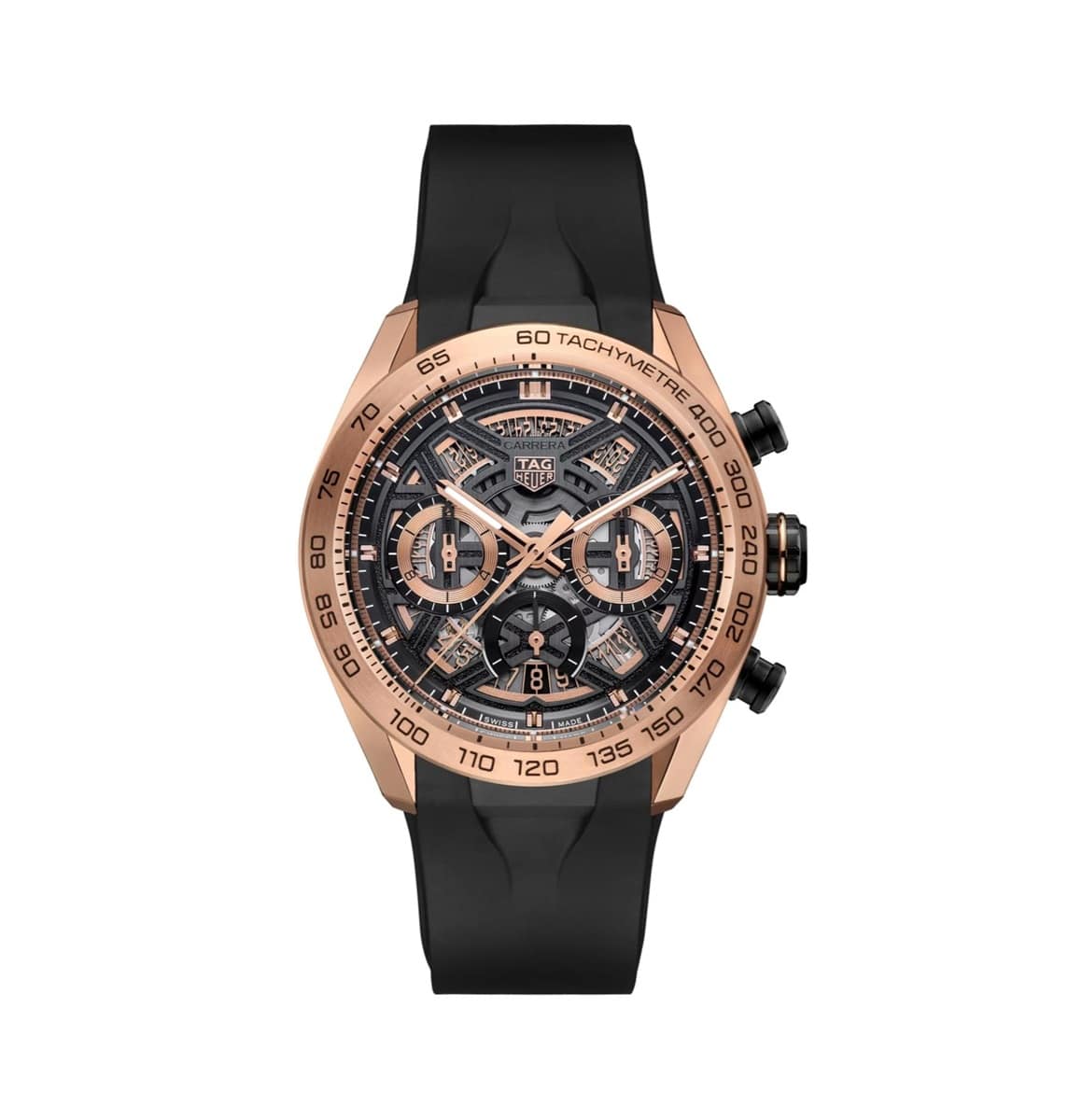 Het opengewerkte wijzerplaatdesign met verfijnde NAC-afwerkingen en een gegranuleerd zwart centrum benadrukt de technische diepte van het horloge. Accenten van 18 karaat roségoud lichten op in de tellers, wijzers en indexen. De 44 mm kast, uitgevoerd in fijn geborsteld en gepolijst 18 karaat roségoud, toont aan de zijkant een uitgesproken architecturale vorm. De vaste tachymeter lunette en zwarte DLC-titanium kroon versterken het sportieve karakter. Aangedreven door het manufactuurkaliber TH20-00 levert het uurwerk een indrukwekkende gangreserve van 80 uur. De geïntegreerde zwarte rubberen band met DLC-titanium vouwsluiting zorgt voor optimaal draagcomfort en zekerheid.