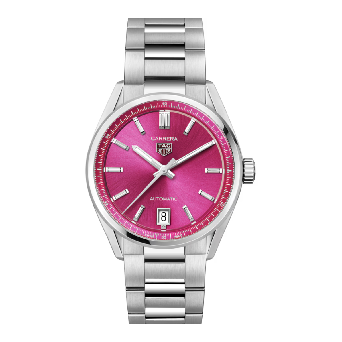 De levendige roze wijzerplaat van deze TAG Heuer Carrera wordt prachtig geaccentueerd door wijzers met witte Super-LumiNova. De 36 mm stalen kast is waterbestendig tot 50 meter en voorzien van een afgeschuind, gebold saffierglas met dubbele anti-reflectiebehandeling. Dit horloge is ontworpen om te weerstaan aan de tand des tijds. Het iconische H-vormige stalen horlogebandje combineert elegantie en stevigheid, met een vouwsluiting en dubbele veiligheidsdrukknoppen voor optimaal draagcomfort en betrouwbaarheid. Een krachtig statement voor wie durft op te vallen.