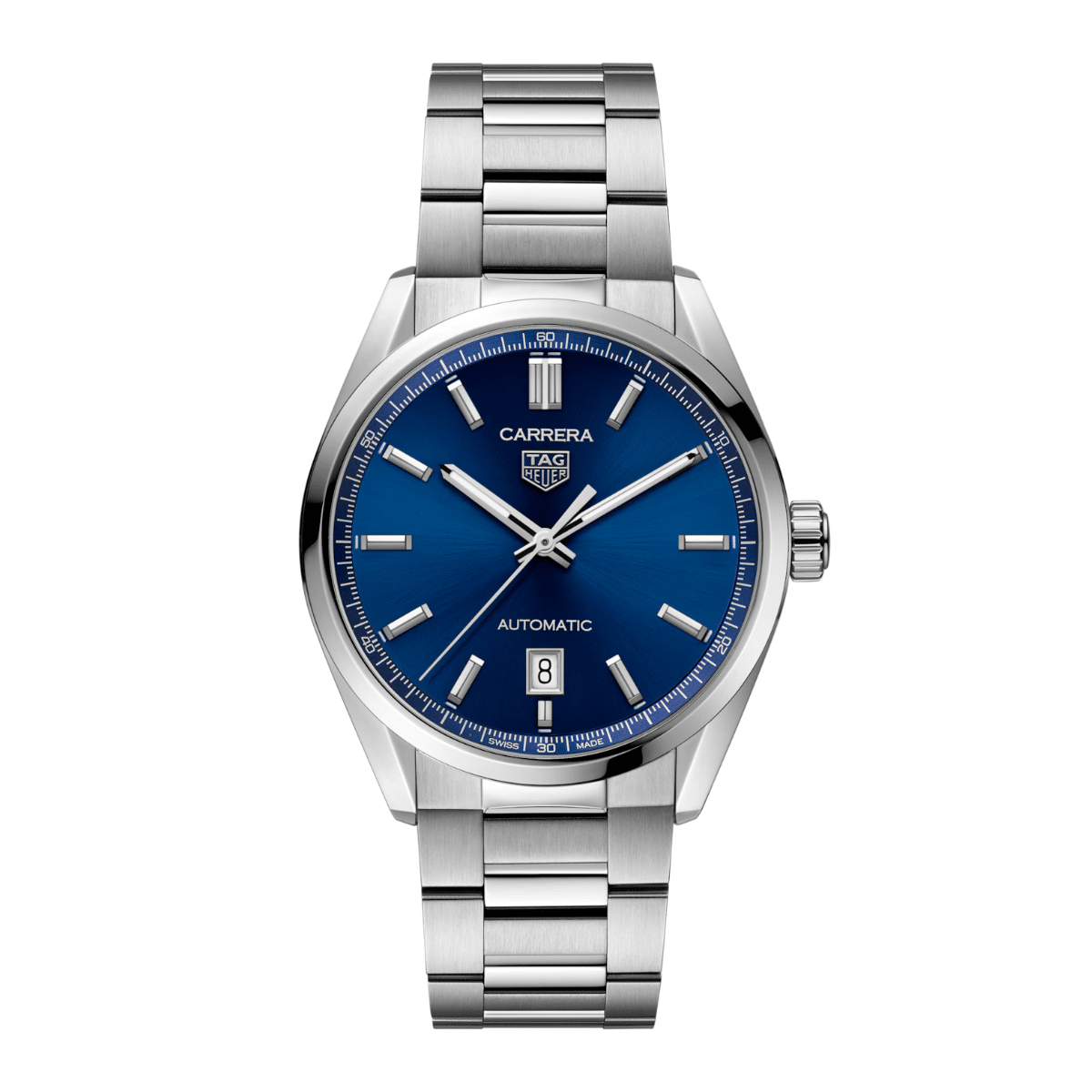 Deze verfijnde TAG Heuer Carrera straalt luxe uit met een nieuw toegepast TAG Heuer-logo. De 39 mm stalen kast, met een mix van geborstelde en gepolijste afwerkingen, omarmt een blauwe sunray-wijzerplaat die beschermd wordt door een gebold saffierglas met anti-reflecterende coating.