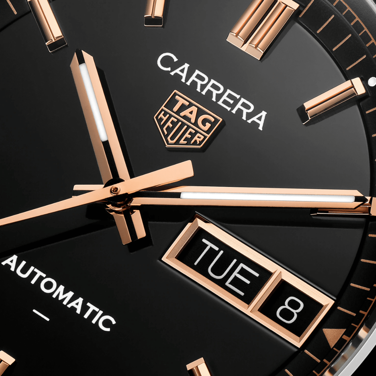 De TAG Heuer Carrera Day-Date belichaamt tijdloze elegantie met een verfijnde zwarte opalin-wijzerplaat, die een mooi contrast vormt met de 18K 5N roségoud vergulde indexen en wijzers. Het gebolde saffierglas versterkt het stijlvolle ontwerp, terwijl de achterzijde van de kast is gegraveerd met een Victory Wreath, dat een symbool is van triomf en karakter.