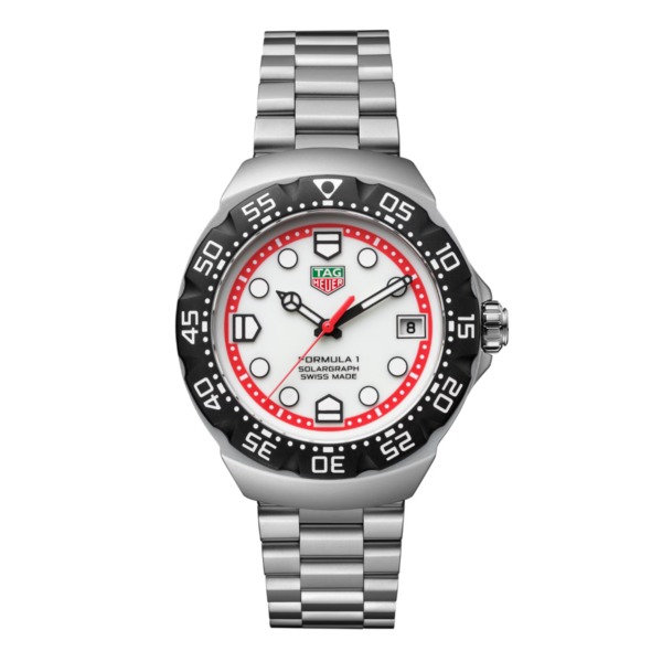 De TAG Heuer Formula 1 Solargraph 38mm straalt gedurfde energie uit met zijn witte opalin wijzerplaat, omlijst door een zwarte TH-Polylight bezel en een opvallende rode flange. Dankzij de zwart gelakte wijzers en indexen met Super-LumiNova is optimale leesbaarheid zowel overdag als ’s nachts gegarandeerd.