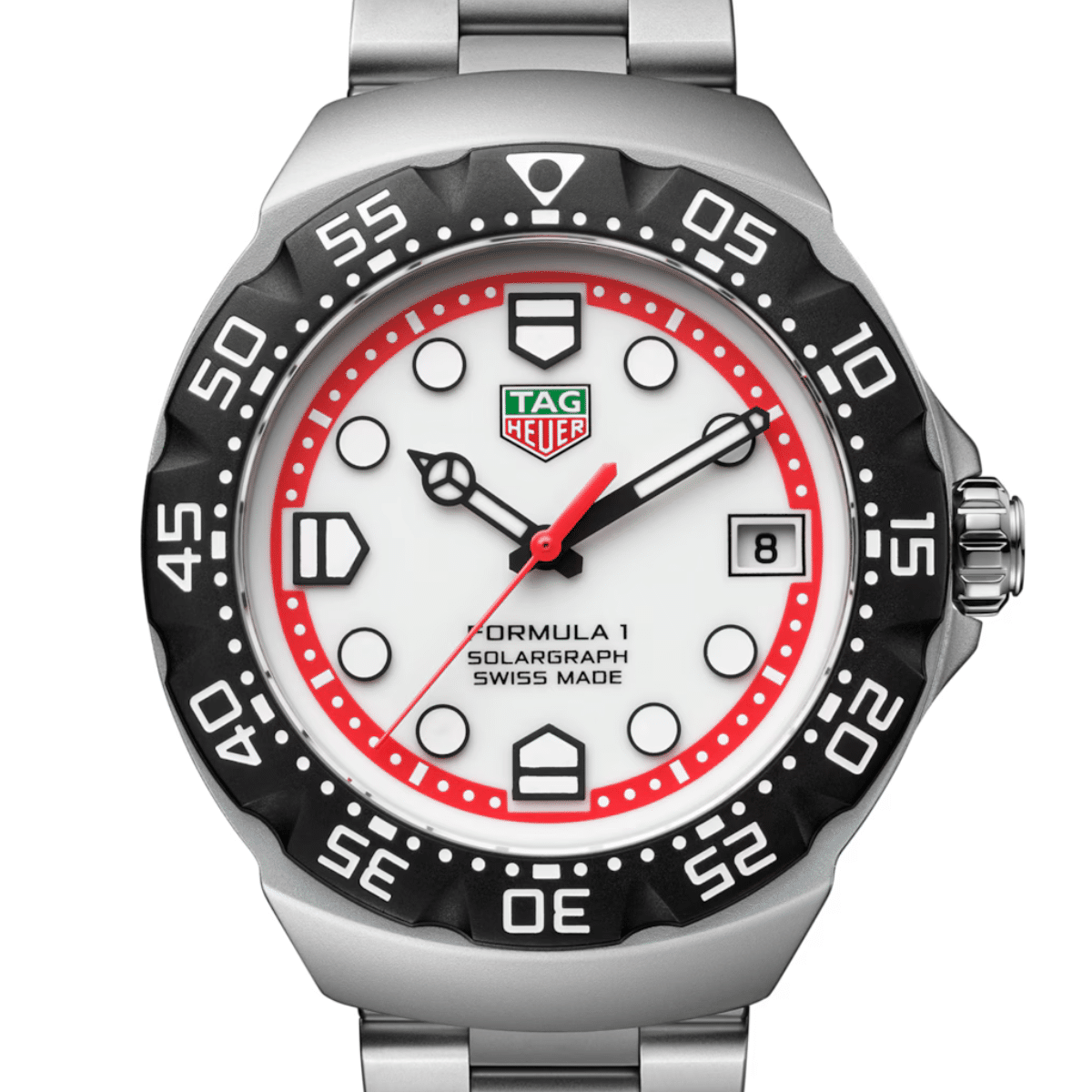 De TAG Heuer Formula 1 Solargraph 38mm straalt gedurfde energie uit met zijn witte opalin wijzerplaat, omlijst door een zwarte TH-Polylight bezel en een opvallende rode flange. Dankzij de zwart gelakte wijzers en indexen met Super-LumiNova is optimale leesbaarheid zowel overdag als ’s nachts gegarandeerd.