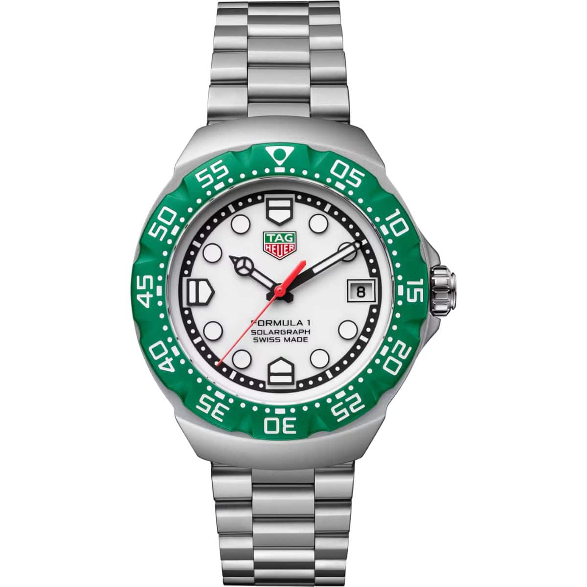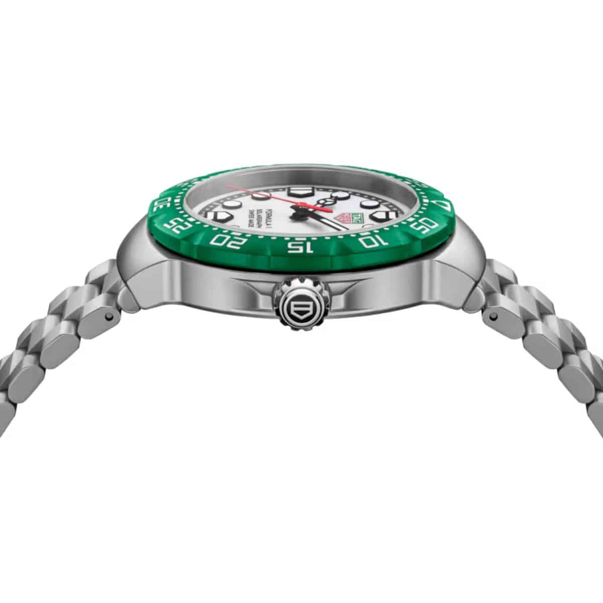 De TAG Heuer Formula 1 Solargraph is een moderne en sportieve interpretatie van de iconische Formula 1-collectie. Dit model met referentie WBY111E.BA0042 valt op door zijn frisse witte wijzerplaat in combinatie met een groene lunette, wat zorgt voor een dynamische en eigentijdse uitstraling.